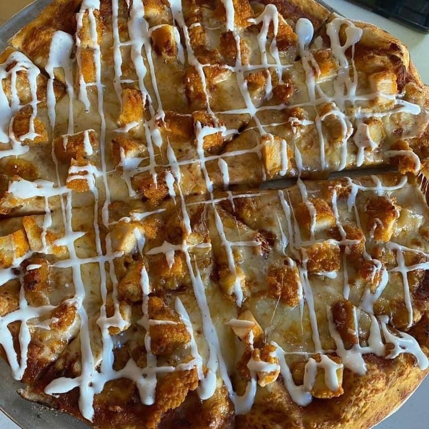 Salsa, queso mozzarella, longaniza, cebolla morada, jalapeños y frijoles. Pizza grande de 35 centímetros.