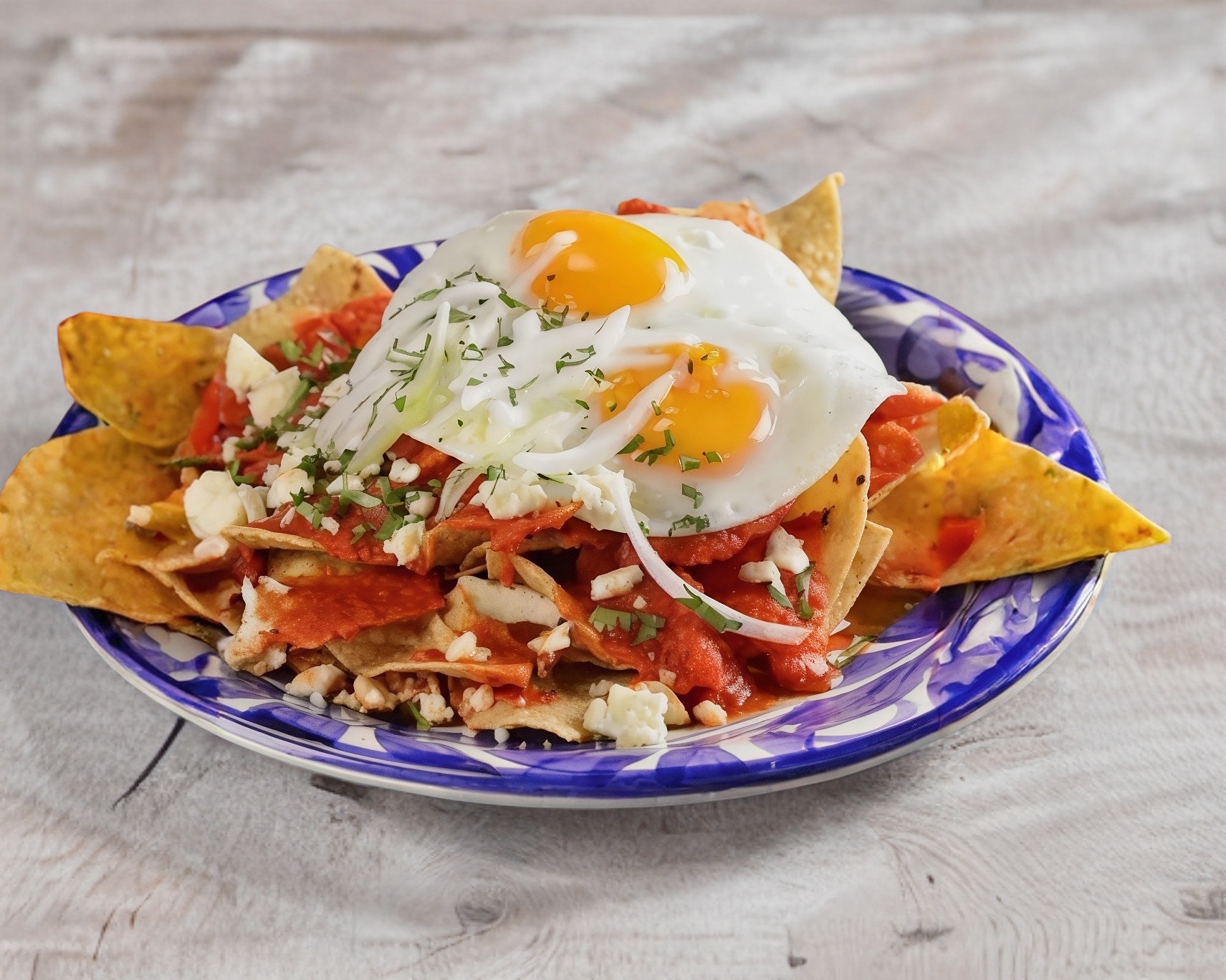 Totopos, salsa roja, crema, queso, cebolla, y dos huevos estrellados