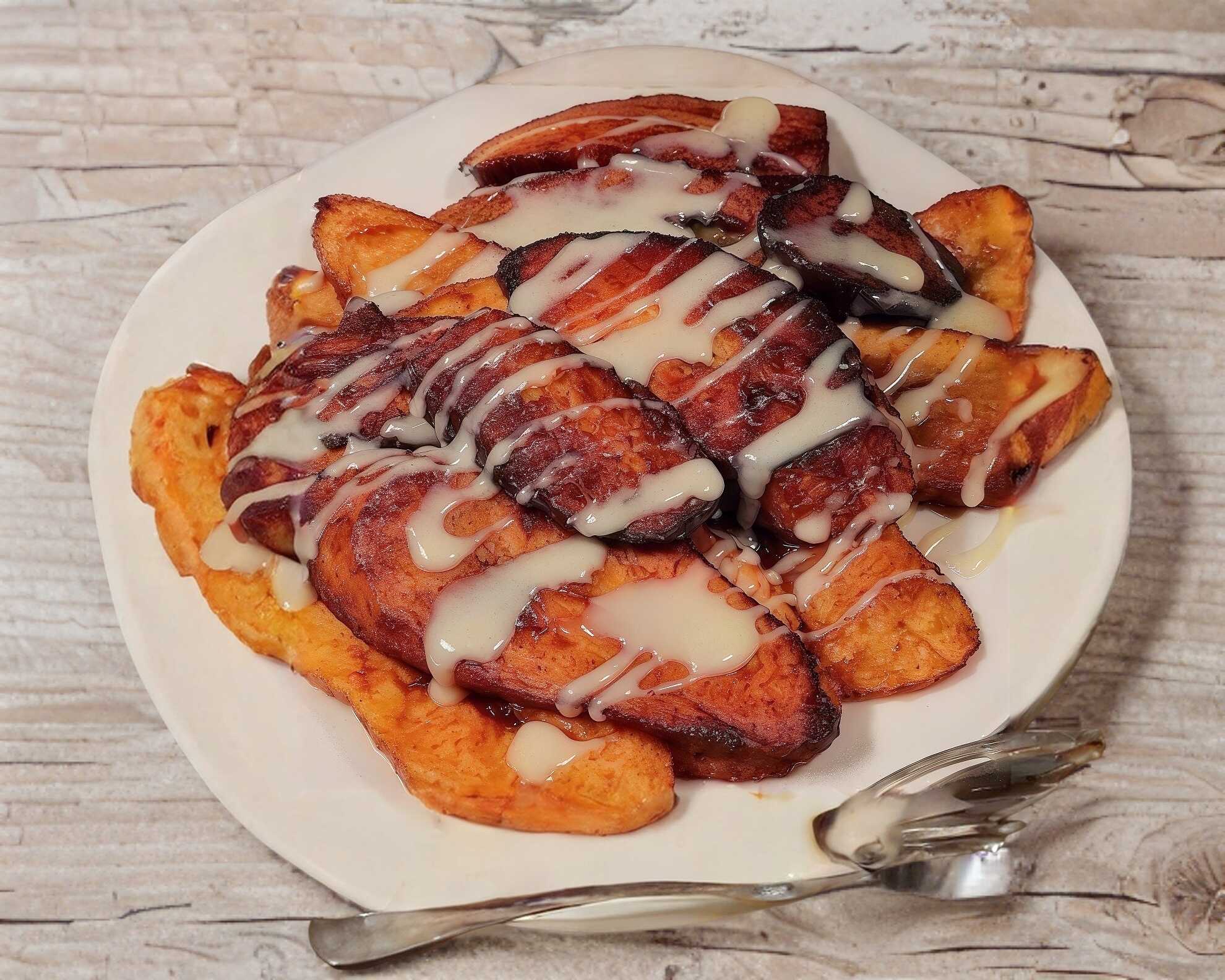 Plátano fileteado frito con lechera