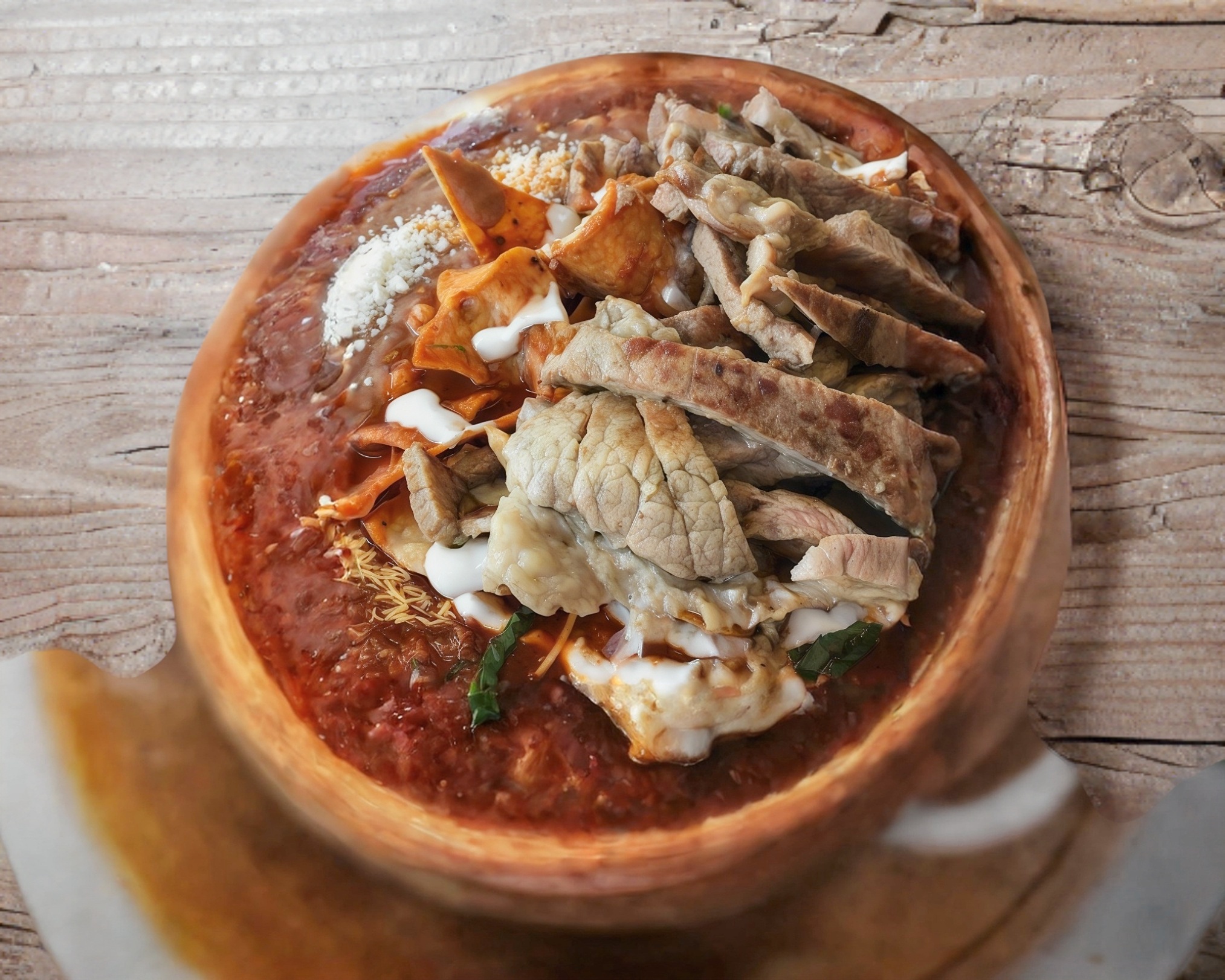 Totopos, salsa roja, crema, queso, aguacate, bistec asado de cerdo fileteado