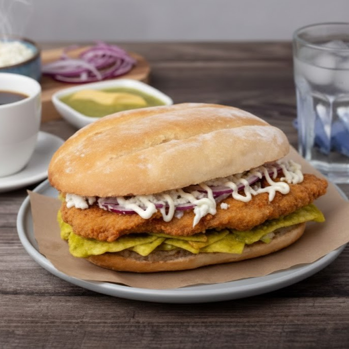 Deliciosa torta de chilaquiles con milanesa, queso, crema, cebolla y aguacate. Perfecta para los que buscan algo crujiente y contundente.