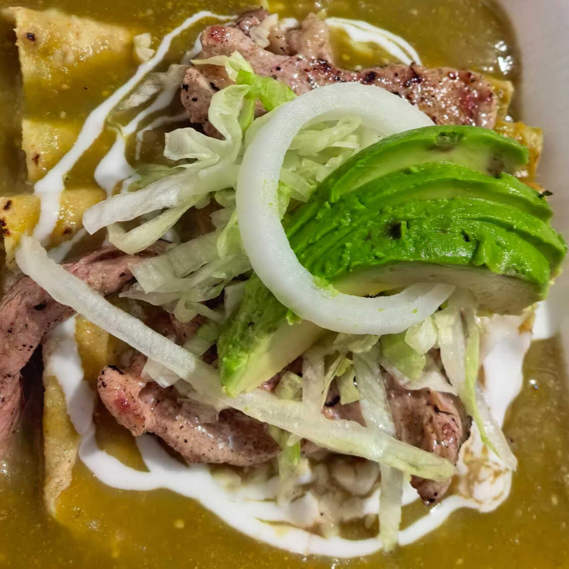 Chilaquiles con pechuga asada, queso, crema, cebolla y aguacate. Llenos de sabor y energía para tu día.