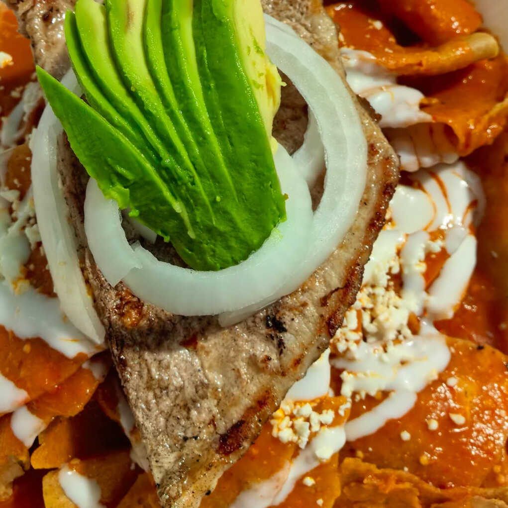 Chilaquiles acompañados de bistec asado, queso, crema, cebolla y aguacate. Perfectos para los amantes de la carne.