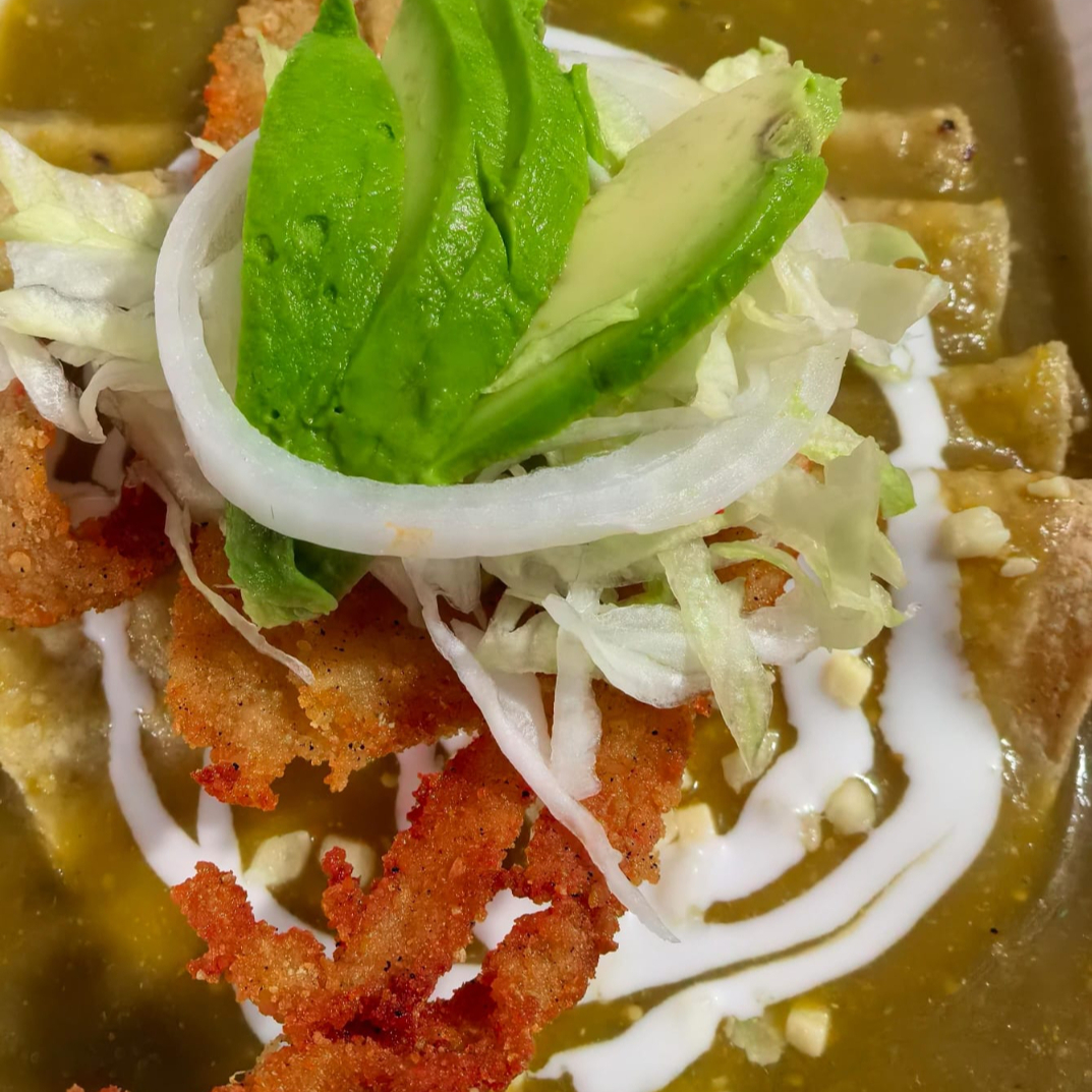 Chilaquiles bañados en salsa al gusto, con huevo estrellado, crema, queso, cebolla y aguacate. La combinación perfecta de texturas y sabores.