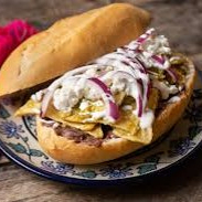 Torta rellena de chilaquiles con pollo, queso, crema, cebolla y aguacate. Un clásico callejero lleno de sabor mexicano.