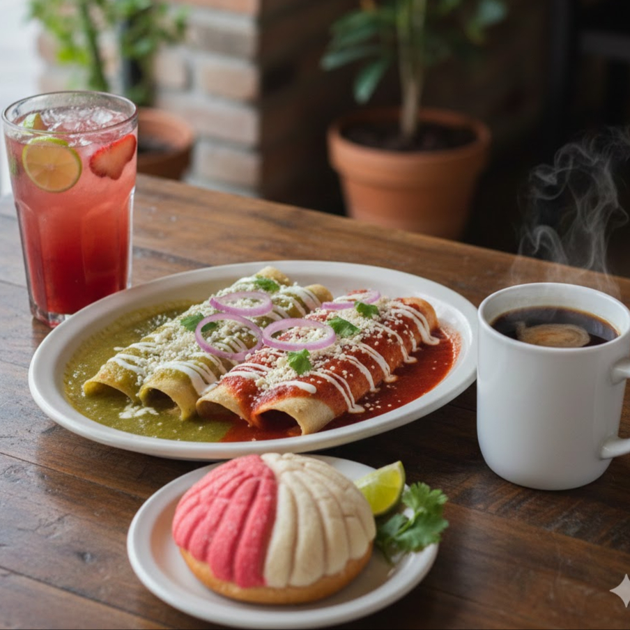 Enchiladas Verdes o Rojas 4 Piezas + Café o Agua de Sabor Frutas + 1 Pieza de Pan Dulce