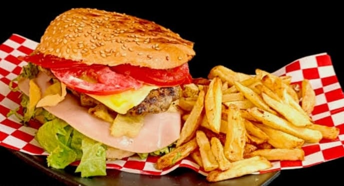 deliciosa hamburguesa de 150gr de carne de sirloin piña jamon queso gouda y cerezas para darle toque especial vegetales aderesos y papas a la francesa