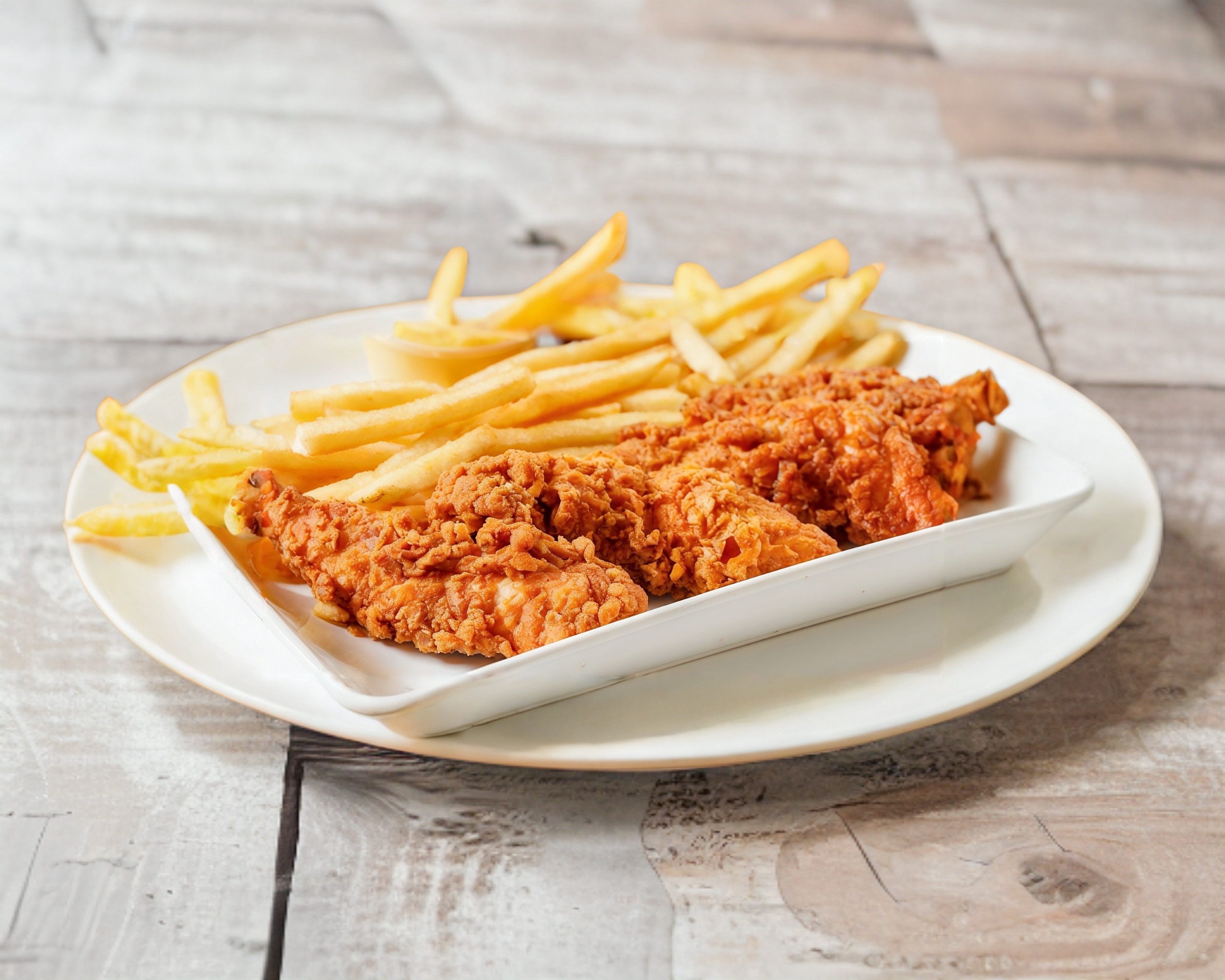 6 tiras de pollo crujientes acompañadas de papas a la francesa y su deep para botanear