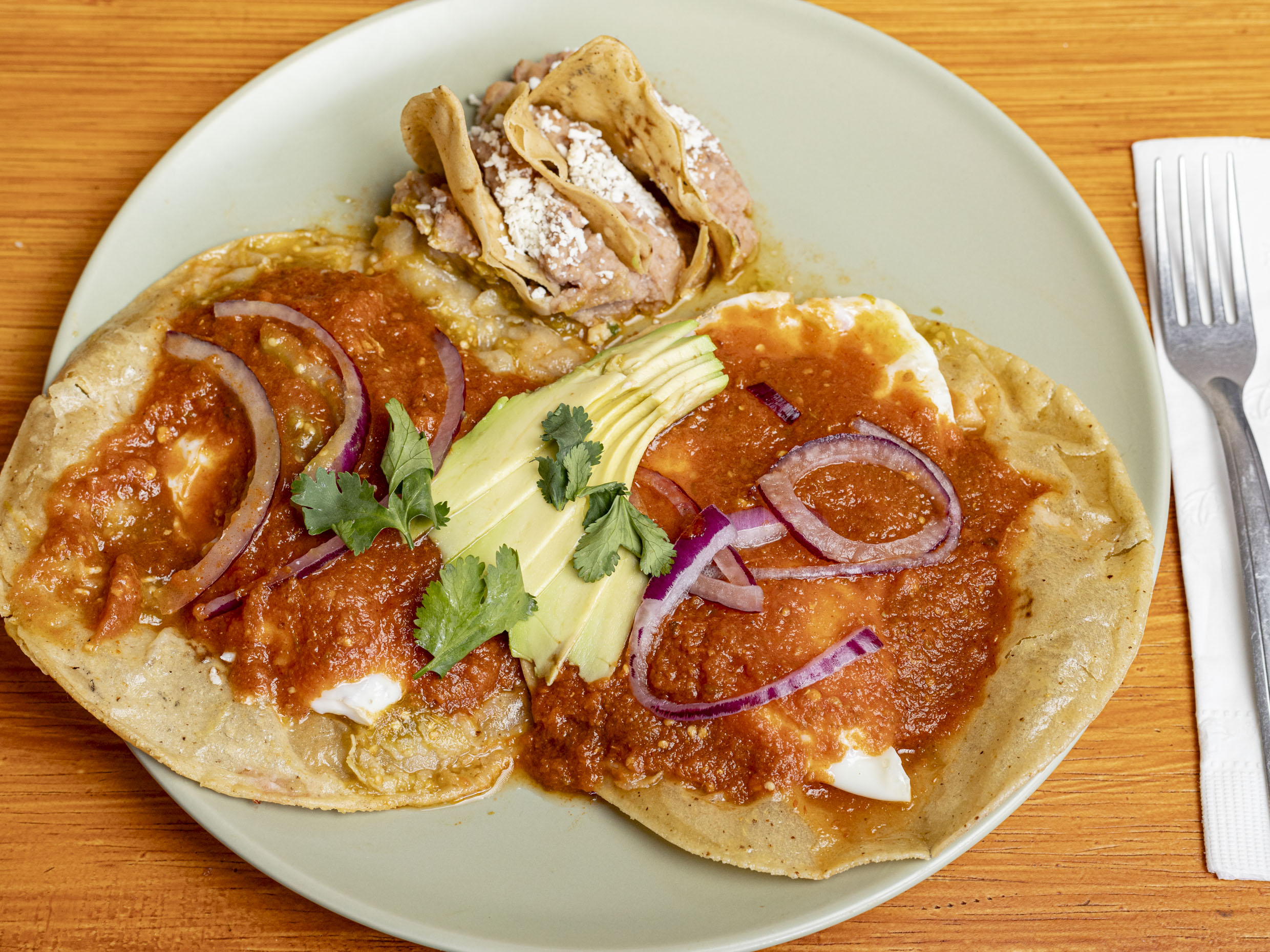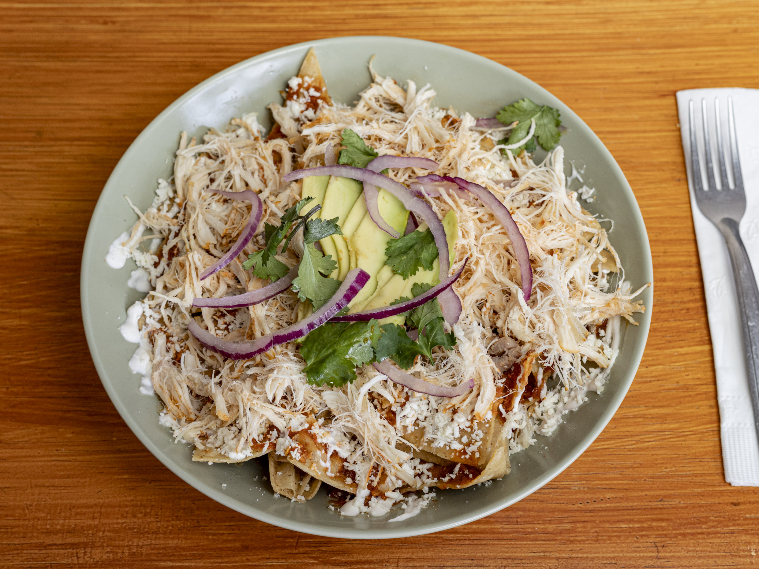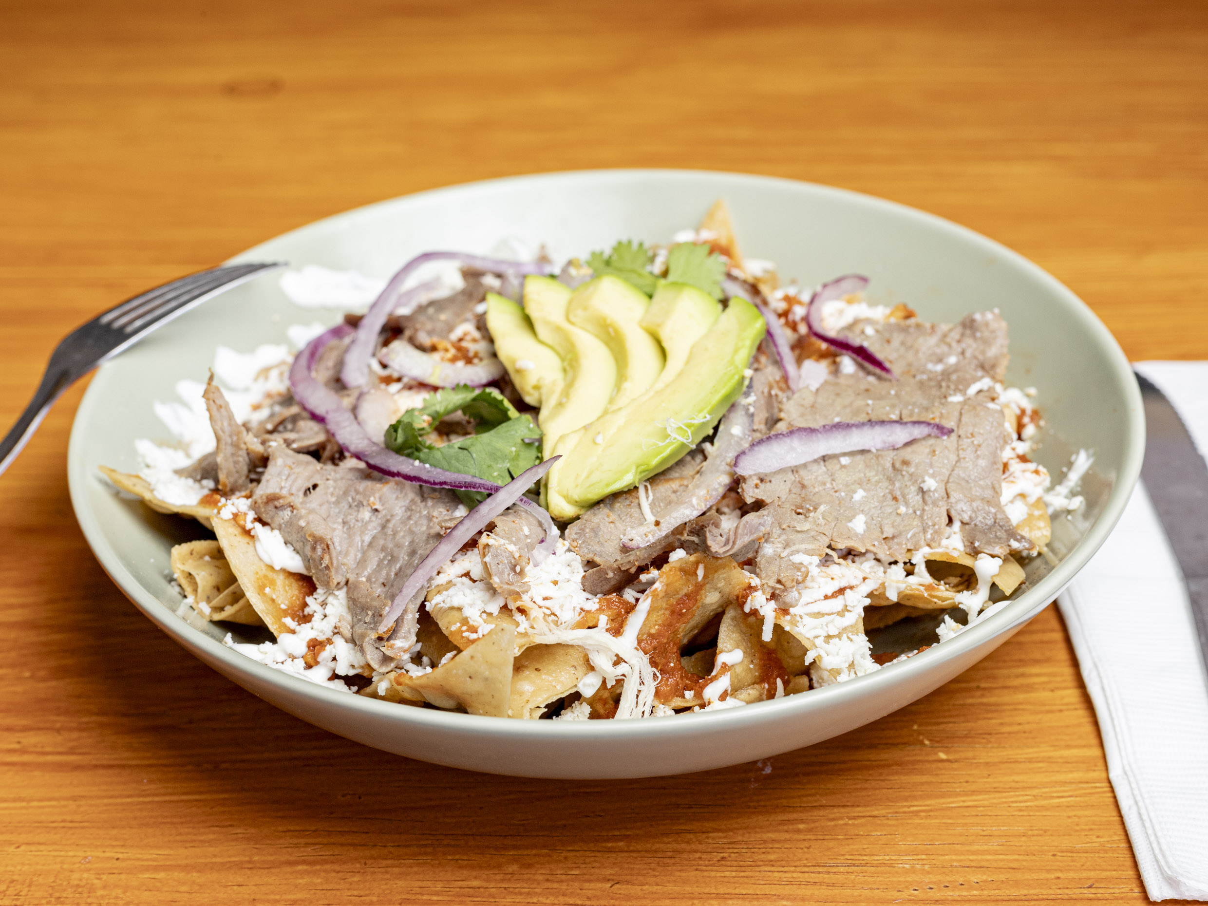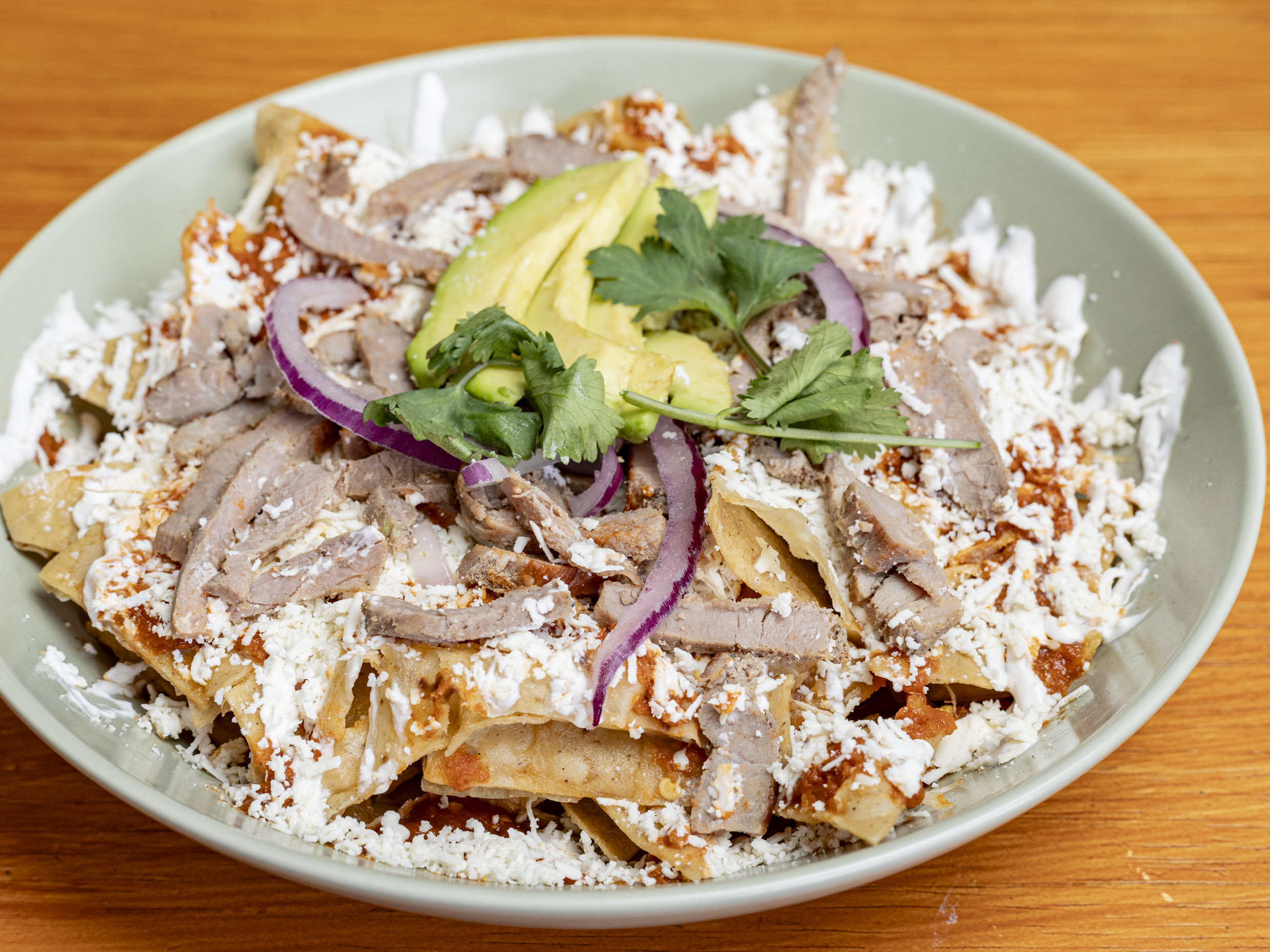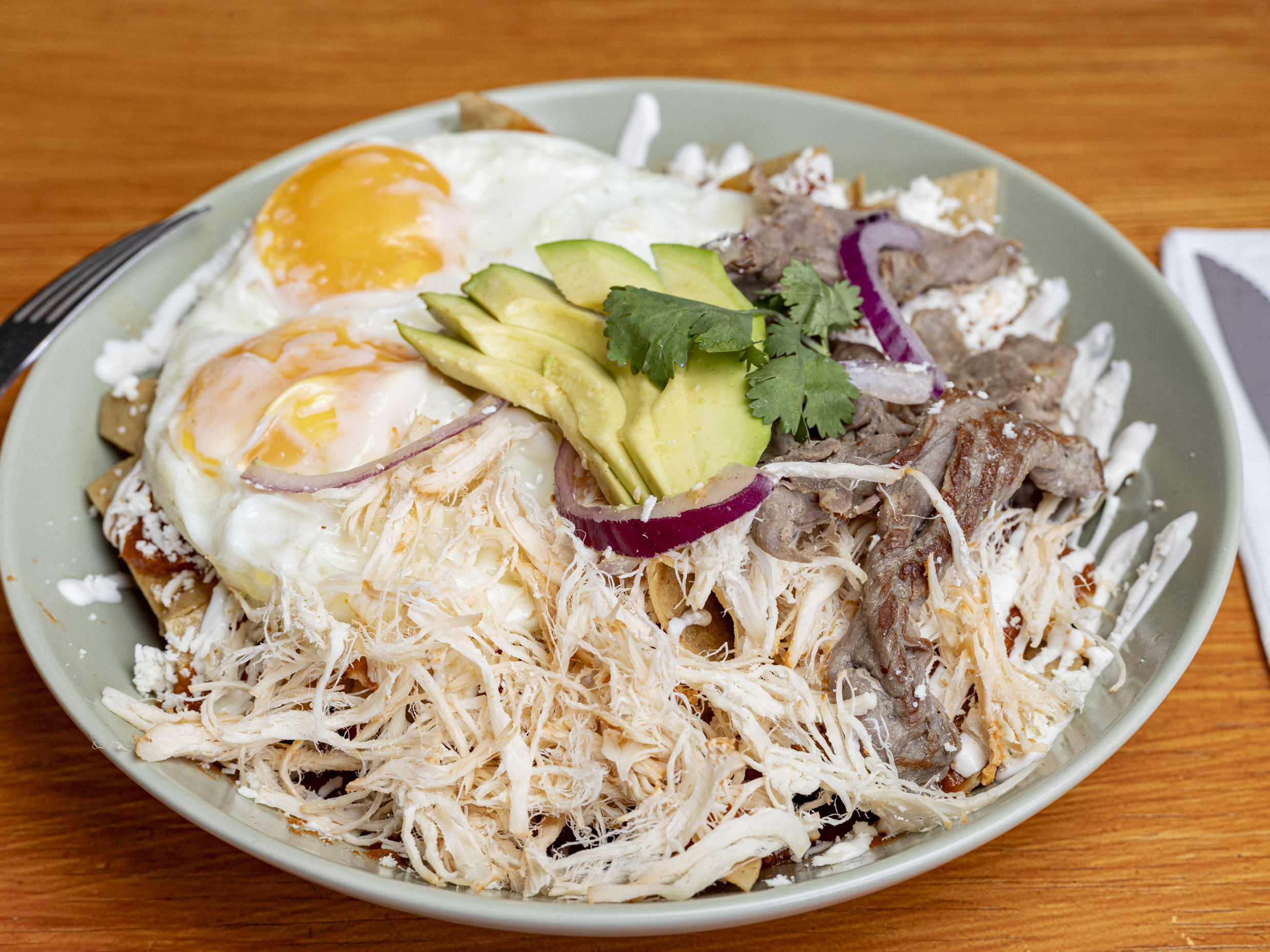 Totopos bañados en tu salsa favorita con pollo, 2 huevos estrellados, cecina, decorado con crema, queso, aguacate, cebolla y cilantro.