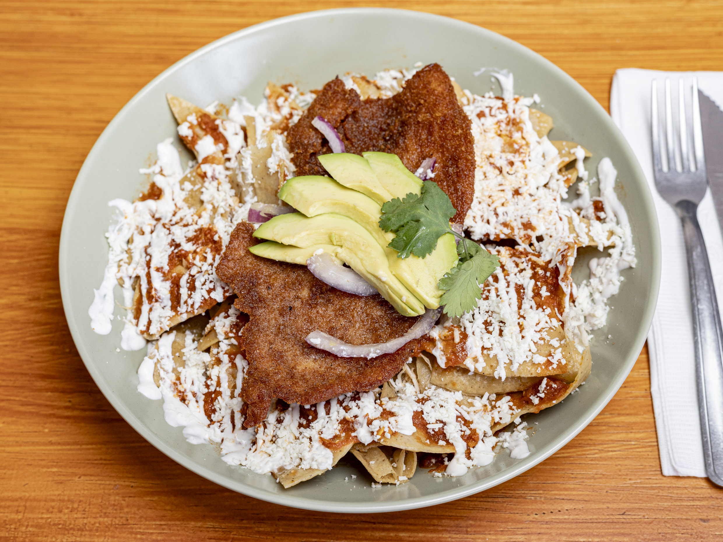 Totopos bañados en salsa de tu preferencia, acompañados de milanesa, crema, queso, cebolla, chile, tampico picado, aguacate y cilantro.