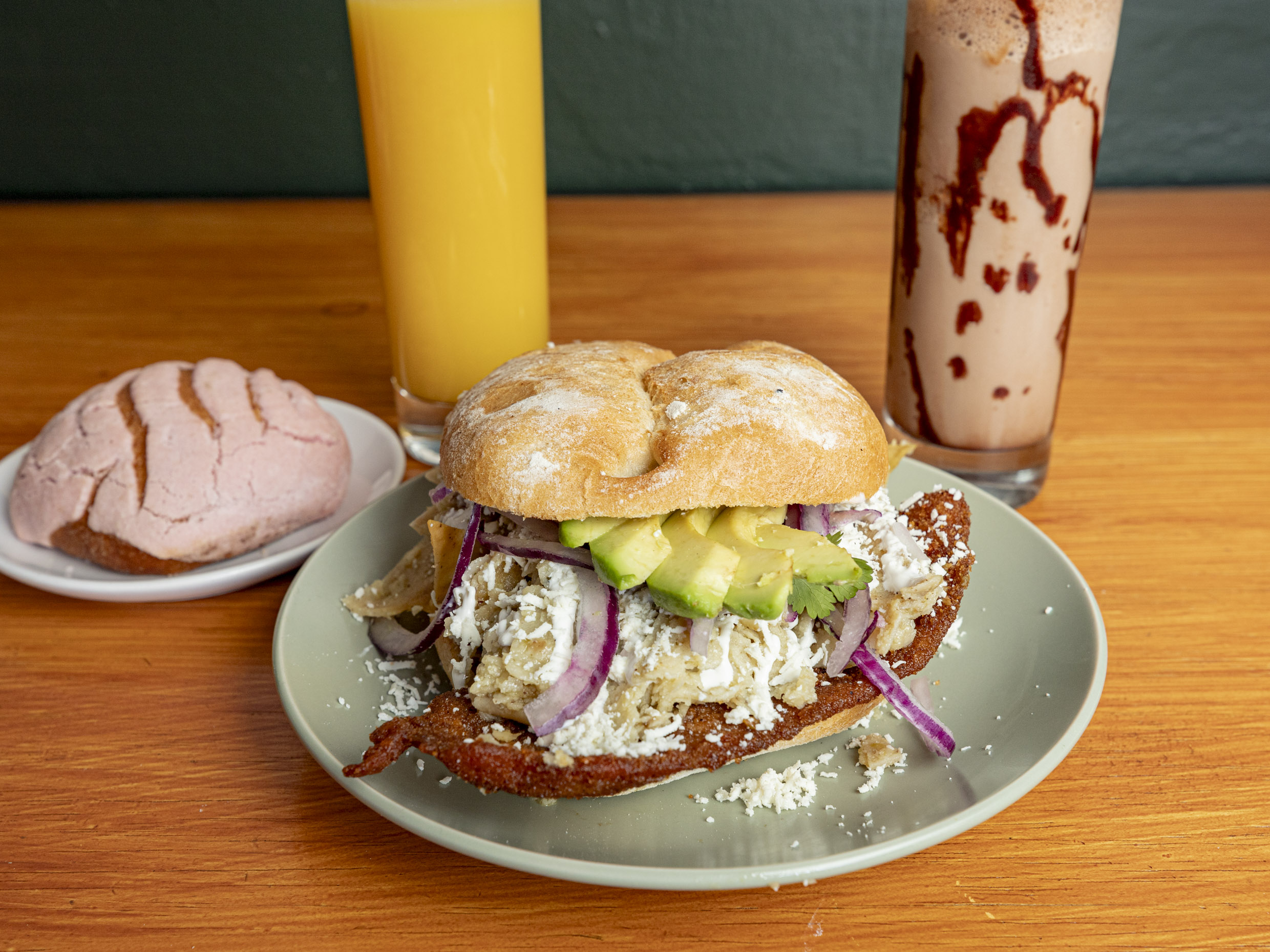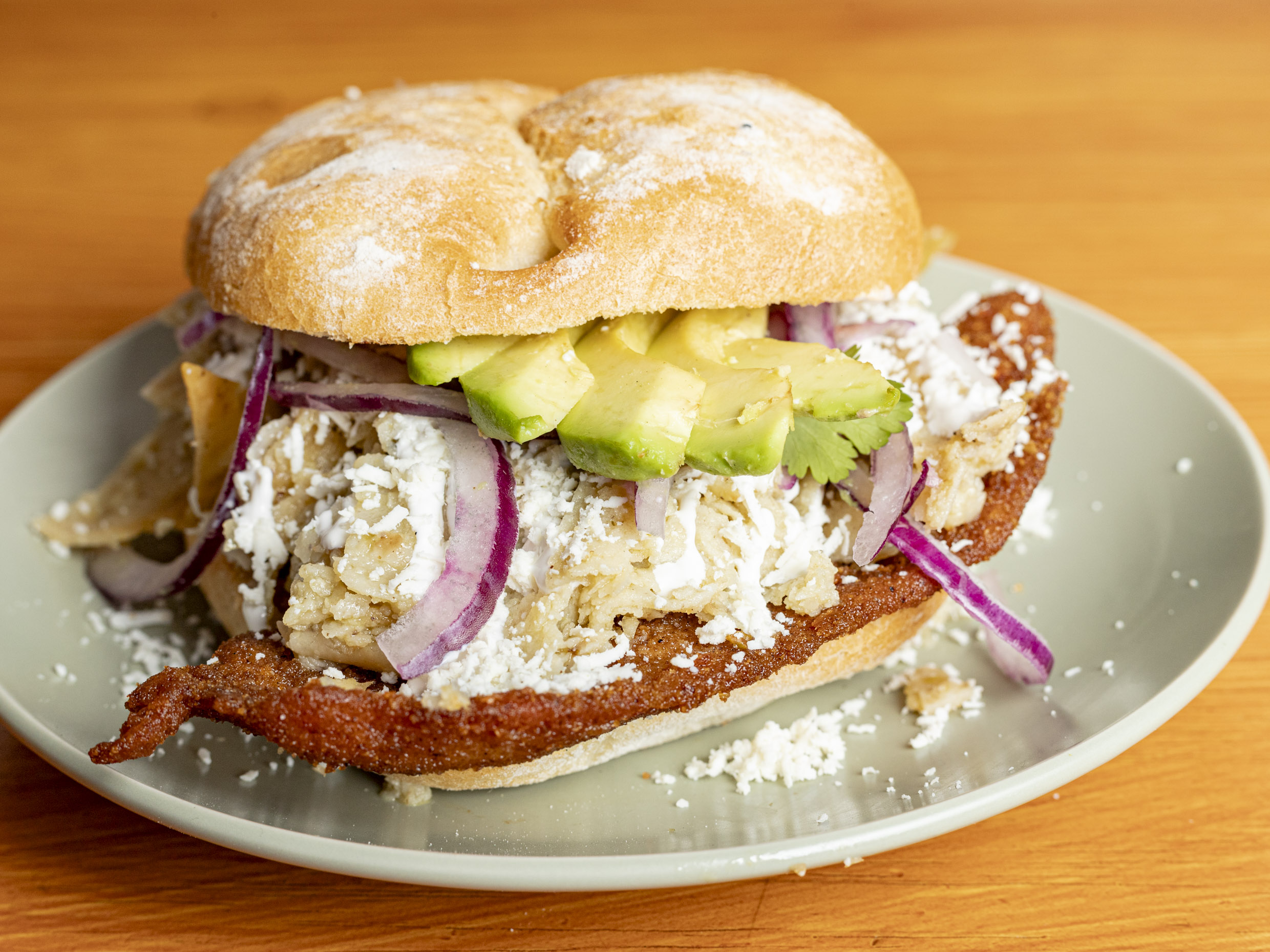Torta con frijoles refritos, chilaquiles con tu salsa favorita, cochinita, decorada con crema, queso, aguacate, cilantro y cebolla.