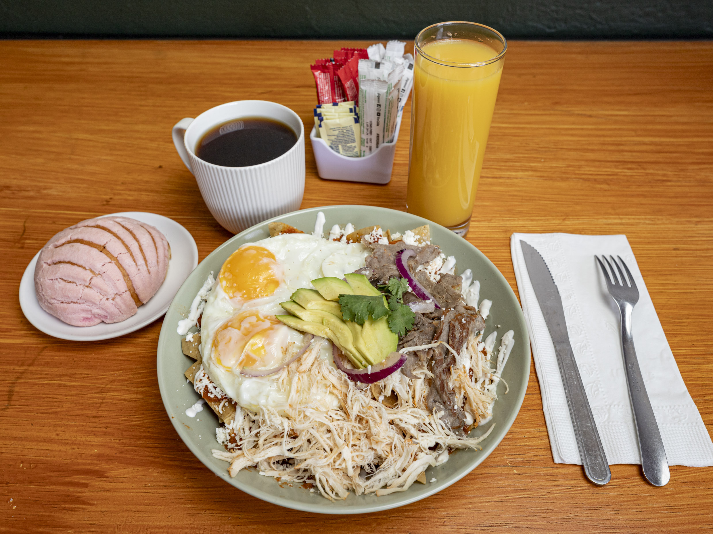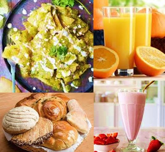 Chilaquiles de la casa + cafe + jugo de naranja + pan dulce