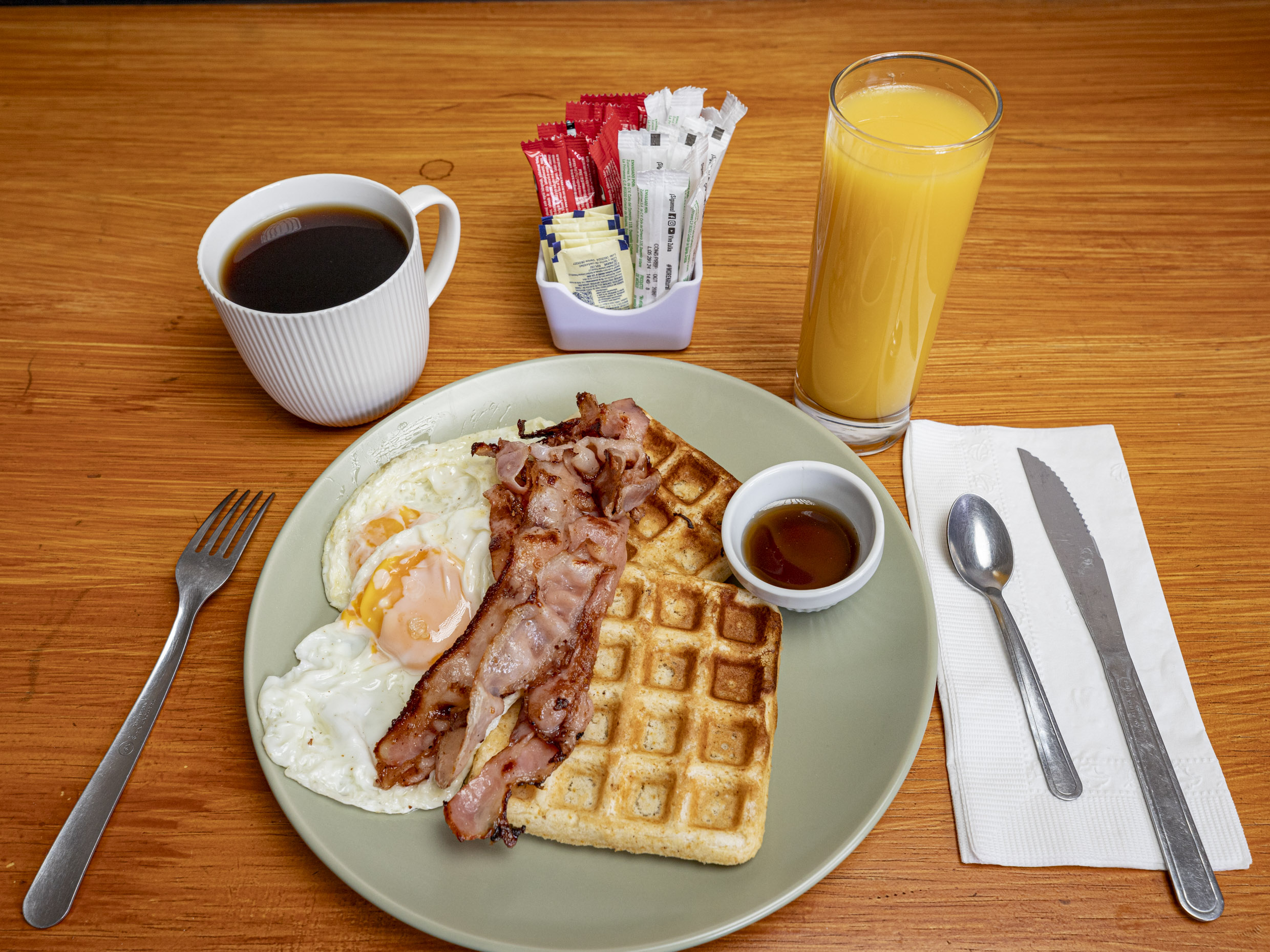 2 Tiras de Tocino*1 + Huevos Estrellados*1 + 2 Waffles con Maple*1 + Café y Jugo*1