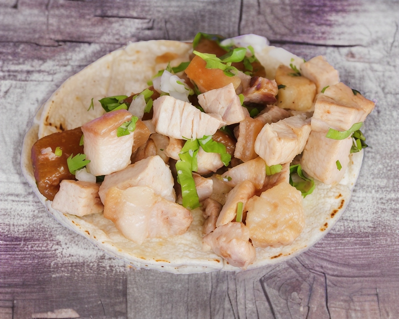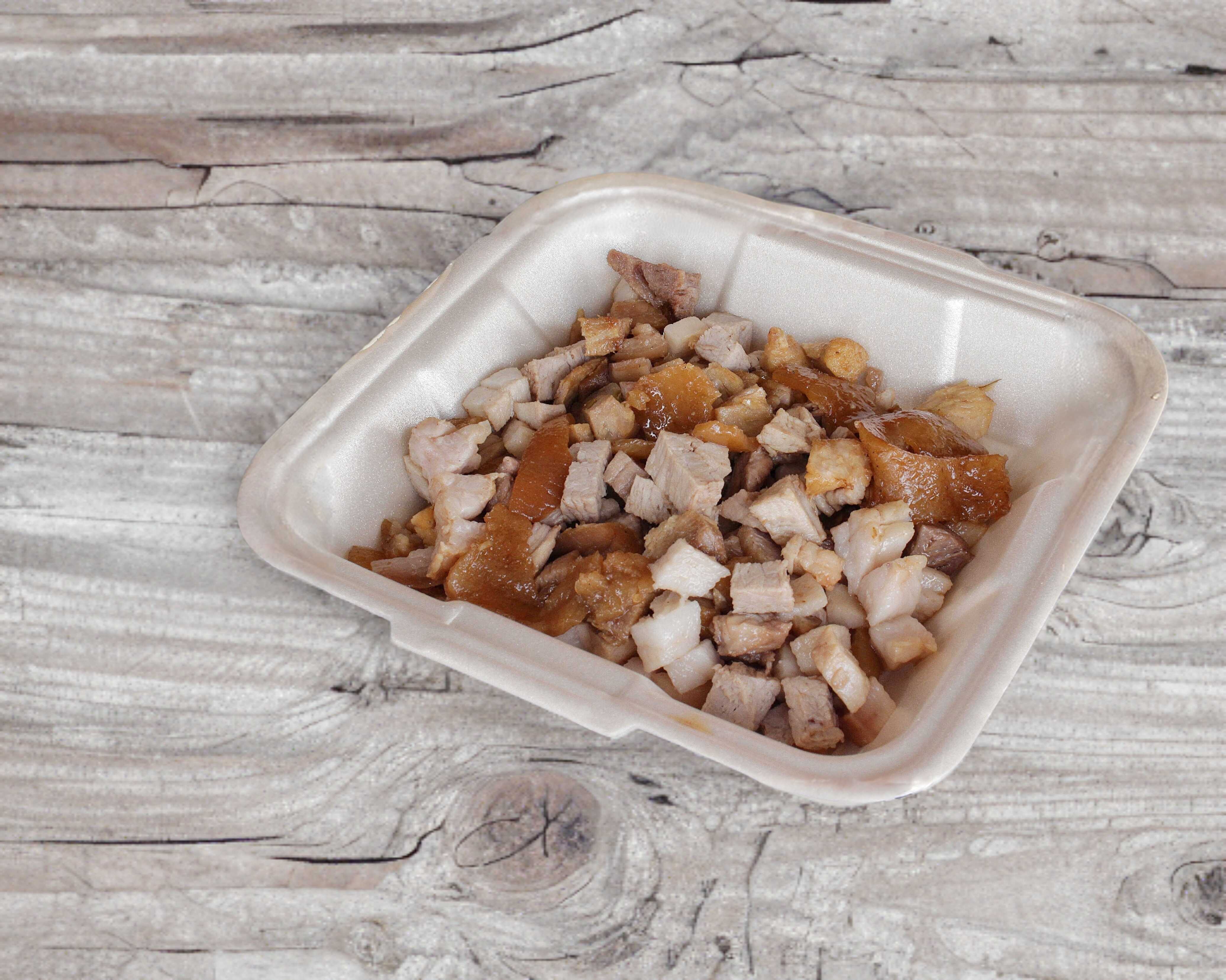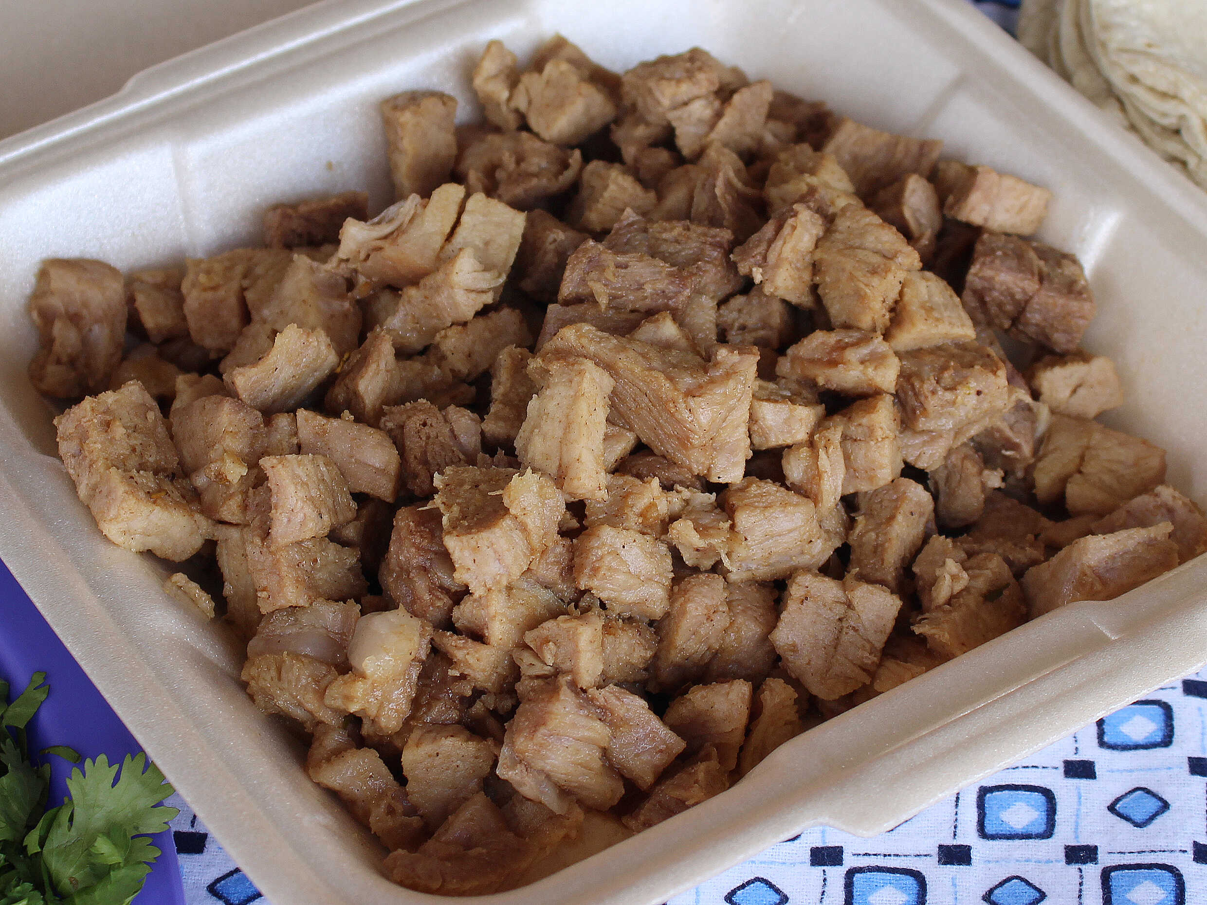 (15g) carne maciza y cueritos , servido en tortilla chica de maíz, acompañado de cebolla, cilantro, limones y (aparte) salsa a elegir.