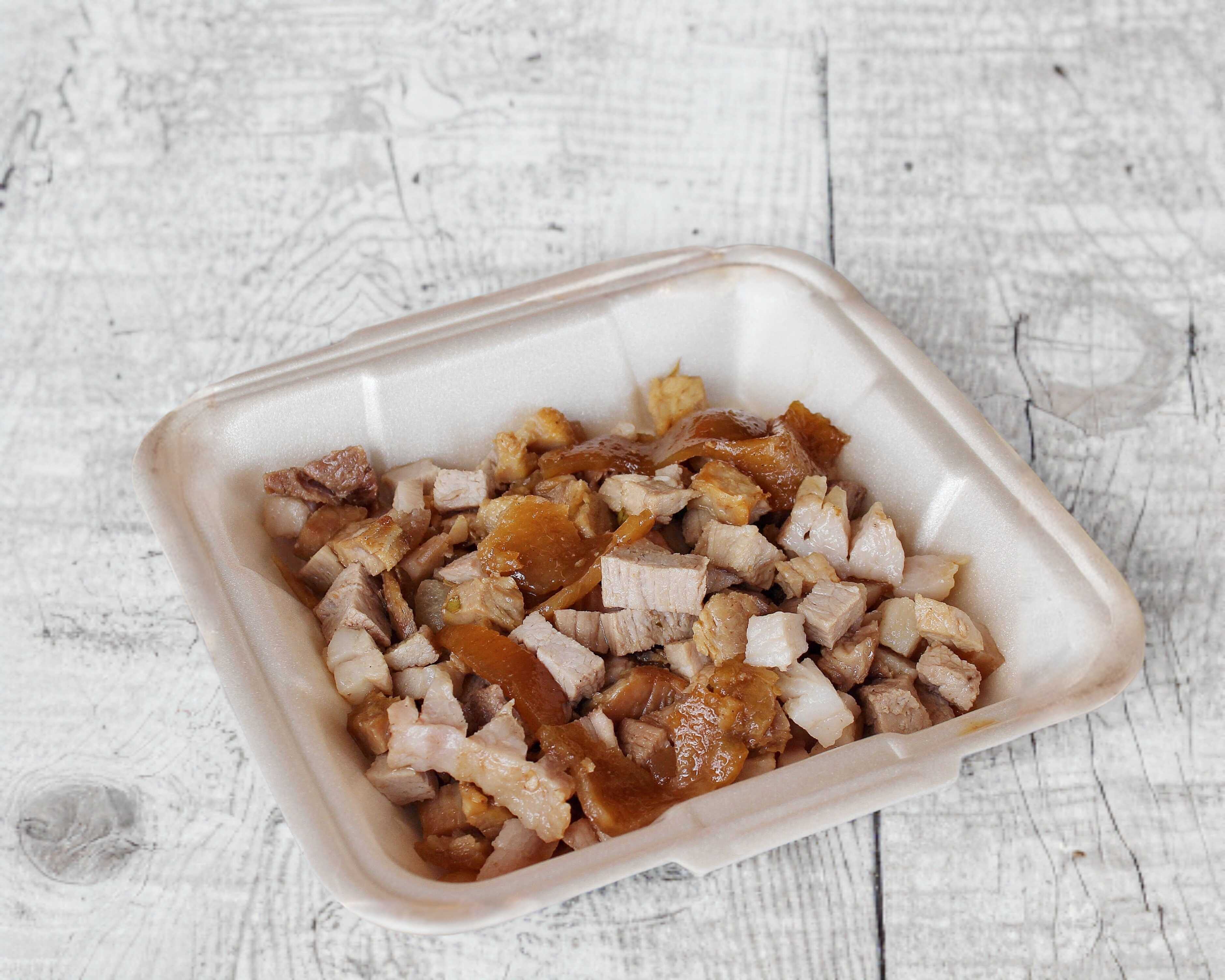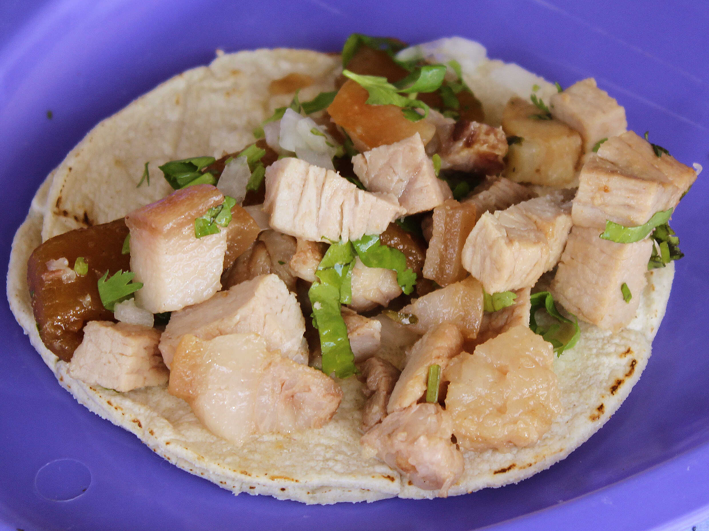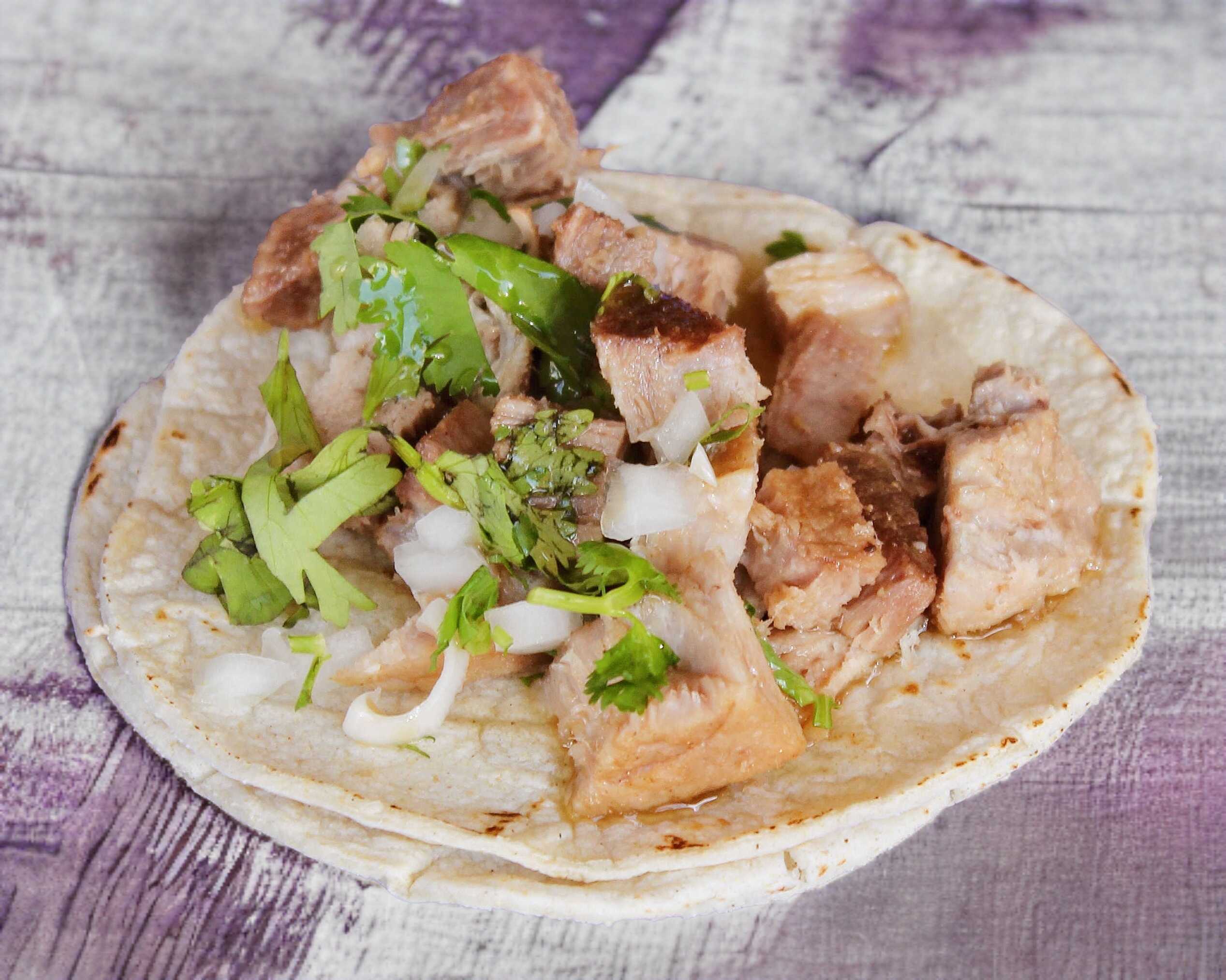 45 g de carne de cerdo, acompañada de limones, cebolla, cilantro y salsa a elegir (verde o roja).