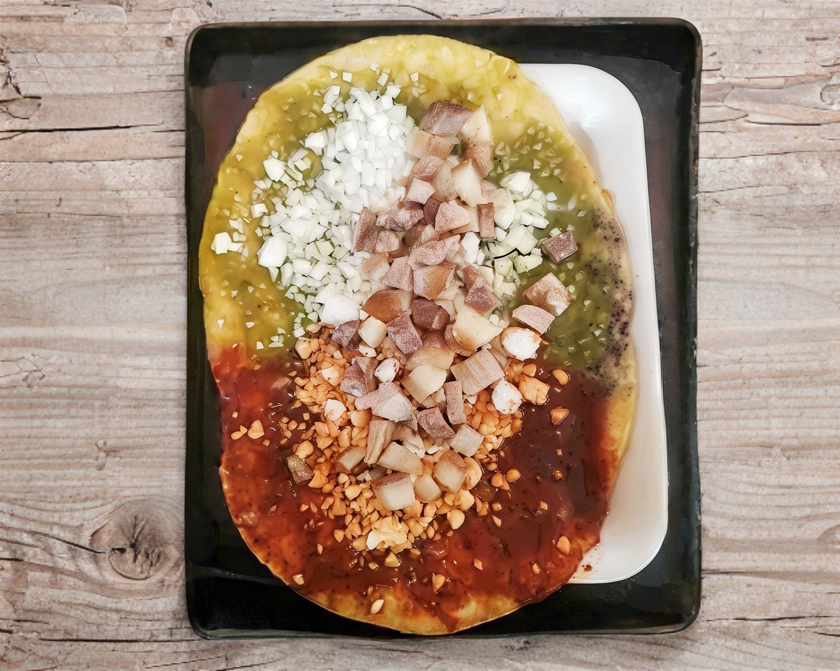 Memela echa de tortilla de maíz con frijoles adentro, acompañada con salsa de jitomate rojo o salsa de tomate verde o salsa bandera, con cebolla y queso, con el extra de carnitas de surtida de cerdo.