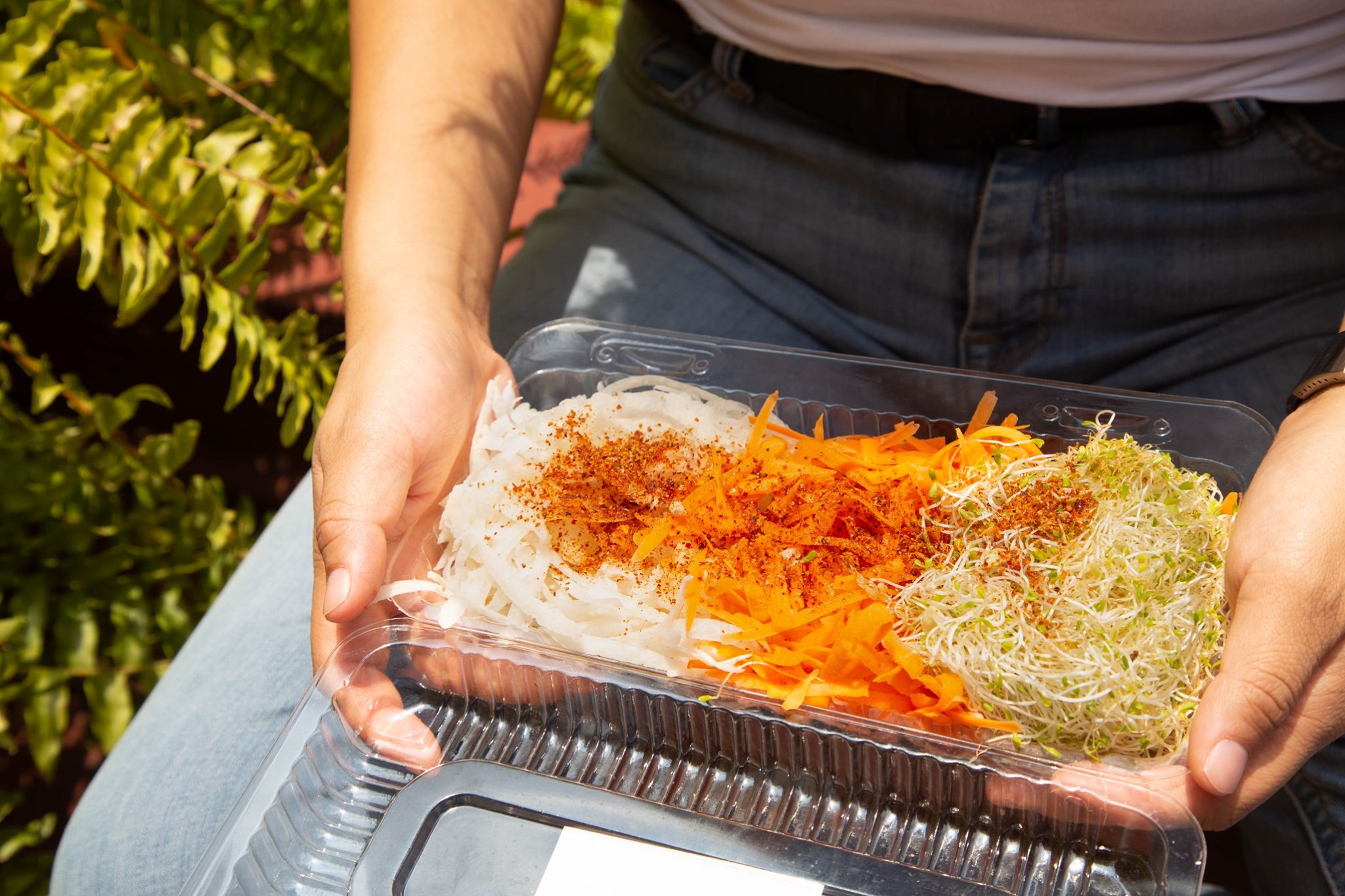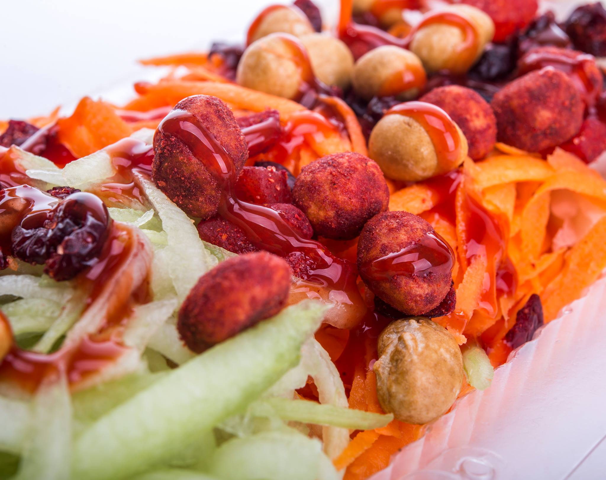 Combinación de jícama, pepino y zanahoria, Preparado con chamoy, miguelito, salsa valentina, salsa botanera, inglesa, maggi, tajín, chile piquín, limón y sal.