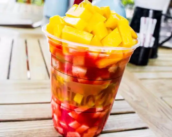 Combinación de pepino, jícama, rellena de una combinación de jugo de maracuyá, chamoy y miguelito, acompañado de un tarugo de dulce de tamarindo.