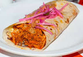 Taco de cochinita pibil en tortilla de harina.