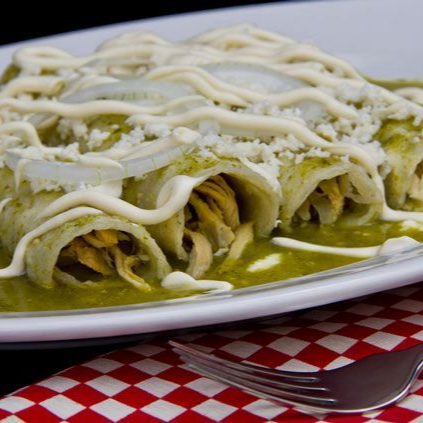 4 piezas de tortilla de maiz sin freir, rellenas de pollo (90gr) bañadas en salsa de su elección, acompañadas de tus toppings favoritos.