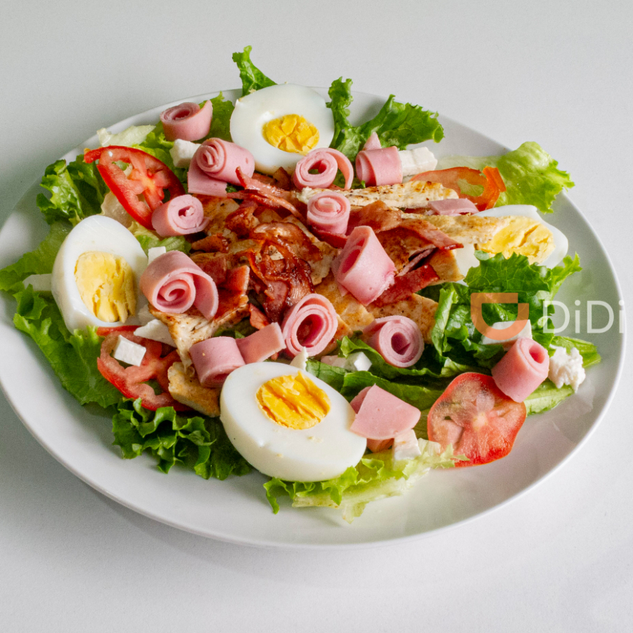 90gr de fajitas de pollo sobre una cama de lechuga italiana acompañada de jamón, queso, tocino, 2 huevos cocidos y rebanadas de jitomate