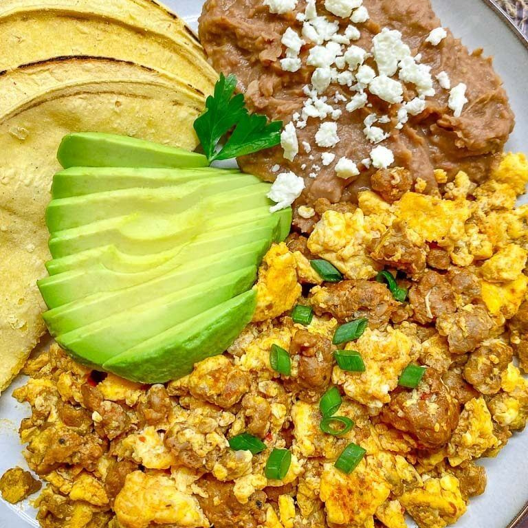 3 Piezas de huevos revueltos con tu ingrediente favorito, cocinado con aceite de aguacate, acompañados de frijoles refritos y totopo (trozos de tortilla de maíz) horneado.