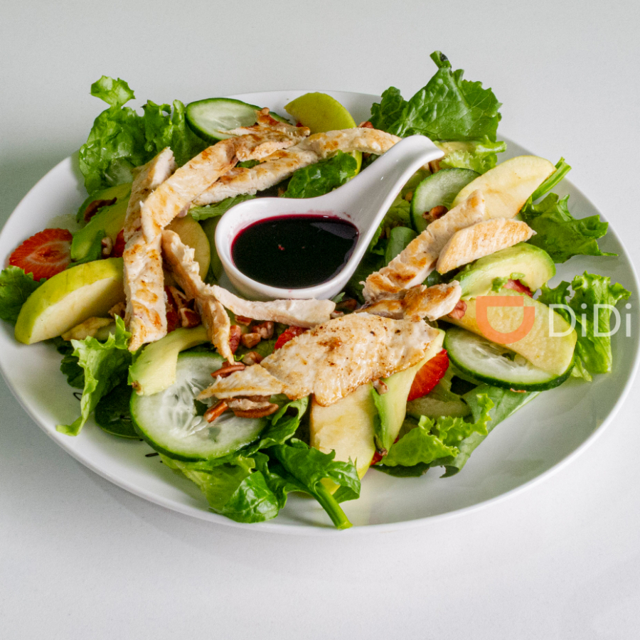 Espinaca, lechuga, manzana, fresa, aguacate, nuez, pepino, pechuga asada y aderezo de jamica