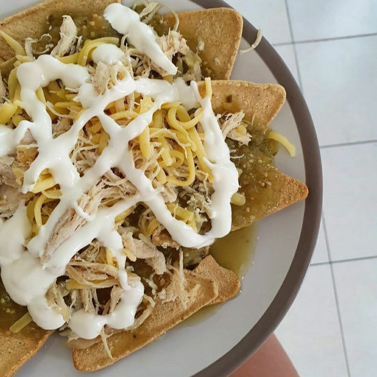 Totopos horneados bañados en salsa de tu elección, acompañados de tus toppings y proteína favorita.