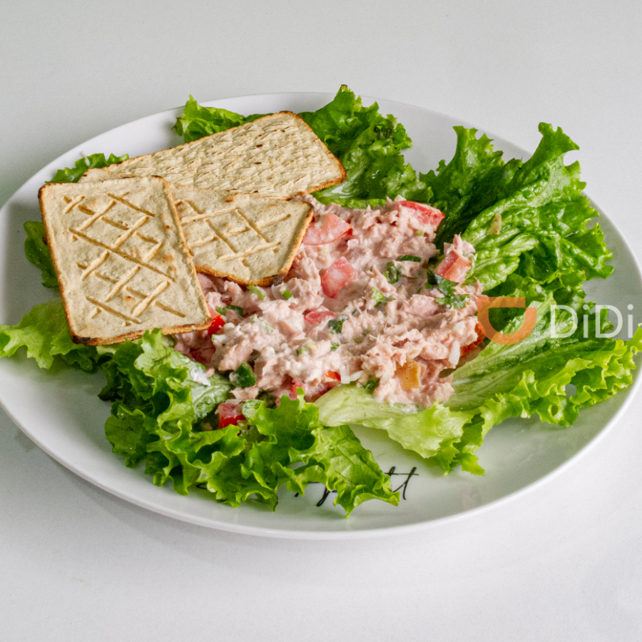 Atún en agua con pico de gallo y mayonesa, montado sobre de lechuga italiana, rodajas de jitomate y salmas