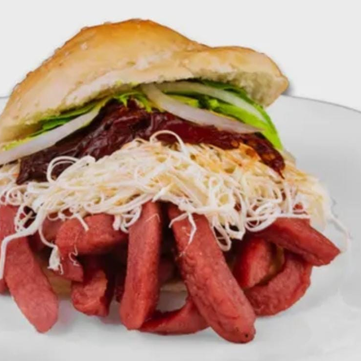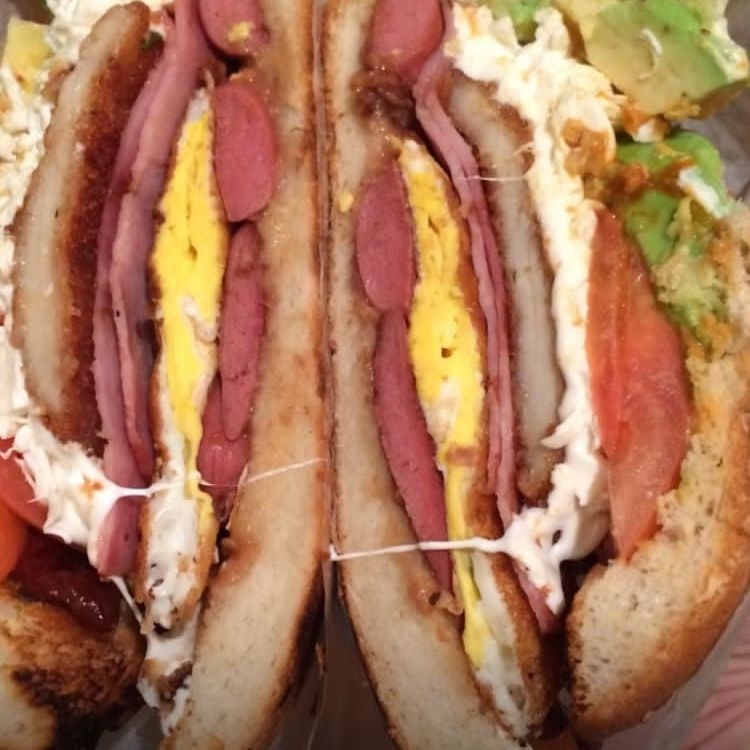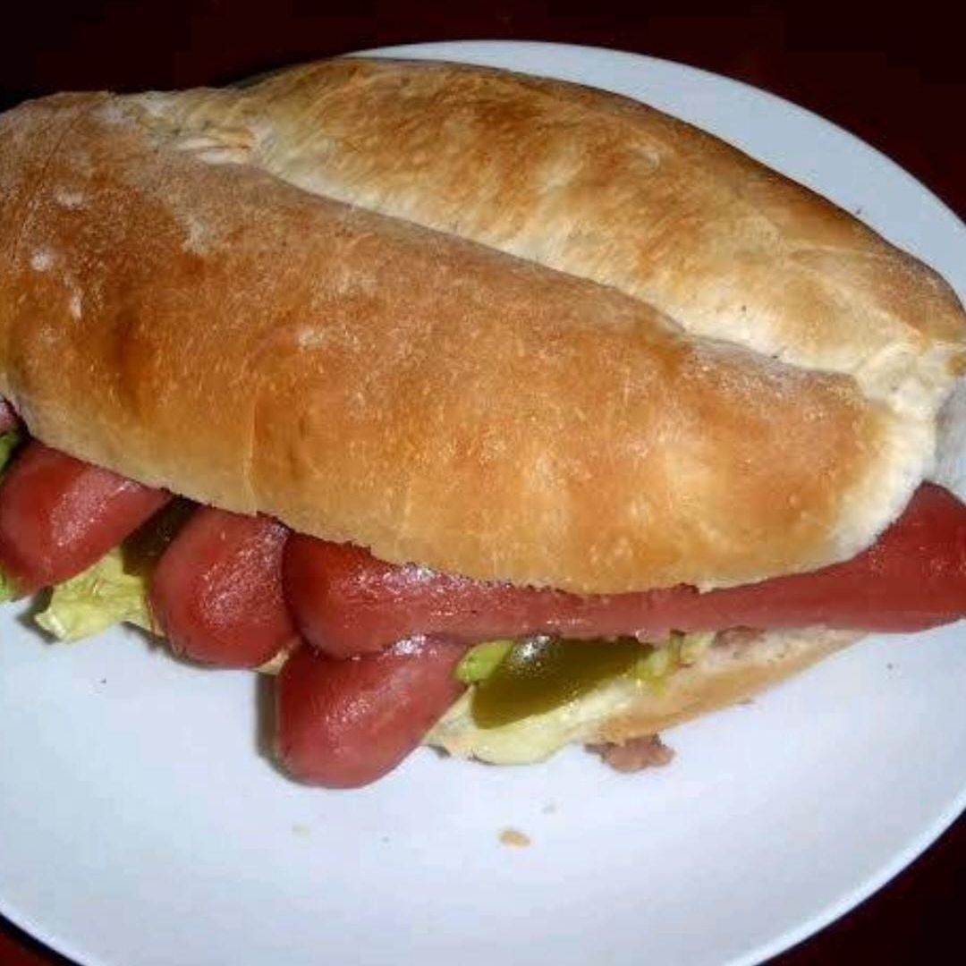 cemita de salchicha acompañada de quesillo aguacate cebolla papalo y picante