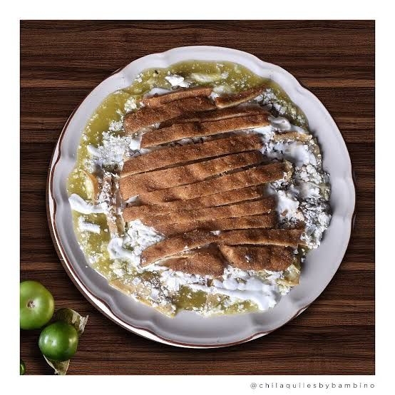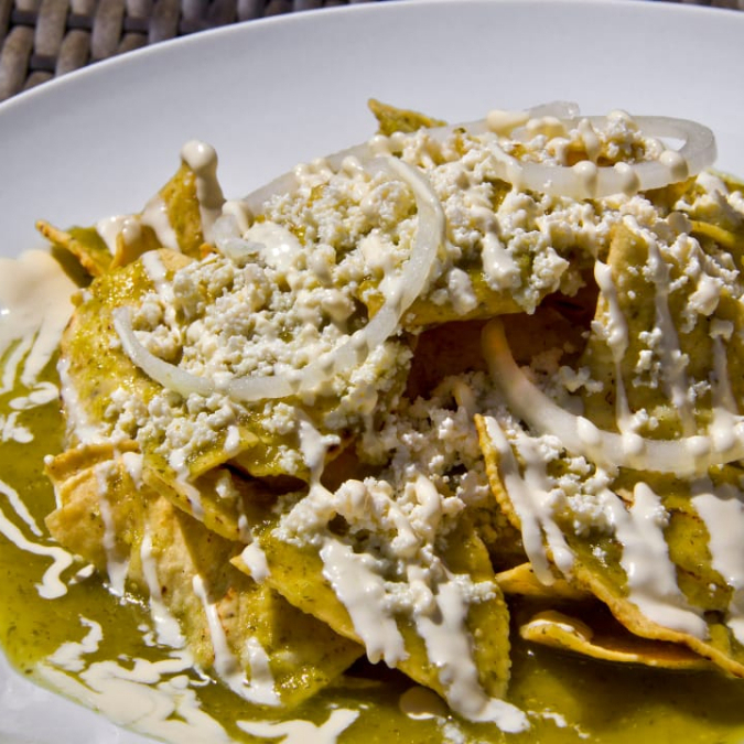 Deliciosos chilaquiles tradicionales verdes acompañados de queso crema aguacate y cebolla