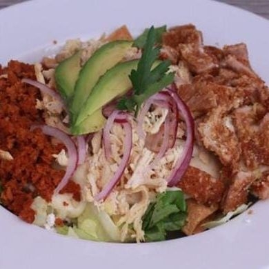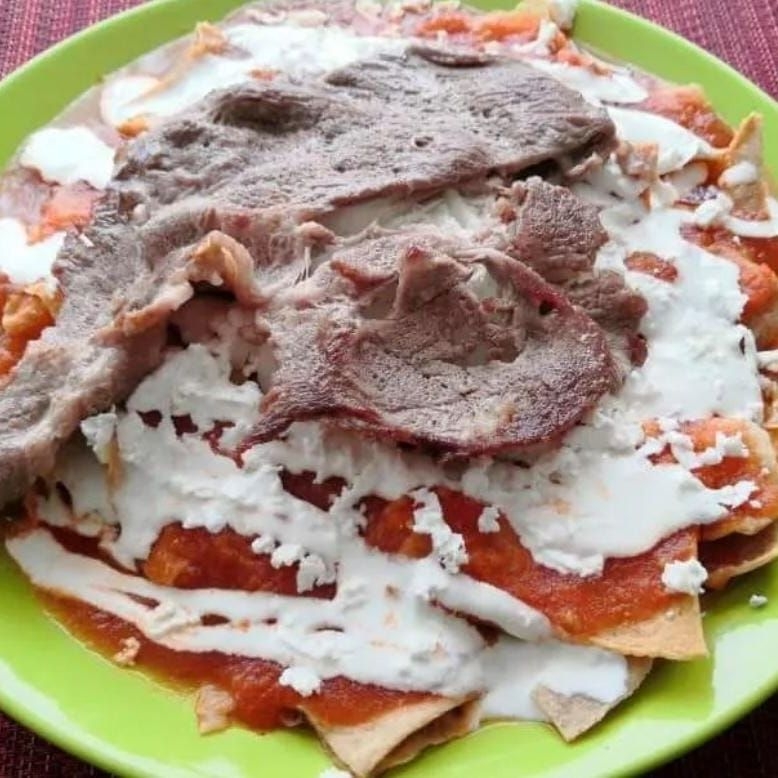 Deliciosos chilaquiles cubanos acompañados de milanesa pollo chorizo cebolla y aguacate
