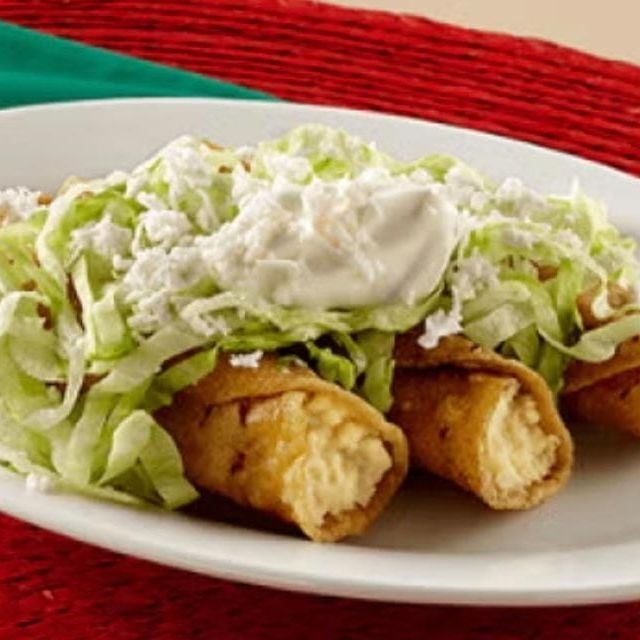 4 Deliciosos tacos dorados 2 de pollo y 2 de queso acompañadas de lechuga queso crema y salsa de tu elección