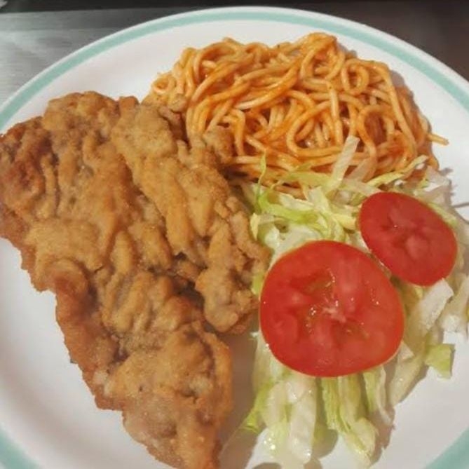 Deliciosa milanesa de pollo acompañada de lechuga zanahoria y jitomate con una exquisita pasta roja