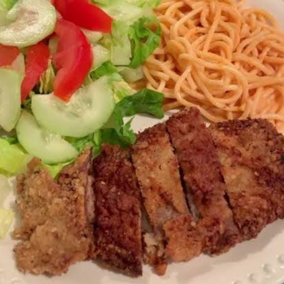Deliciosa milanesa de puerco acompañada de pasta ensalada zanahoria pepino lechuga