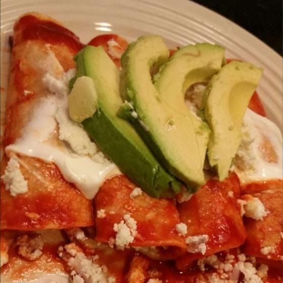 Deliciosas enchiladas rojas rellenas de pollo acompañadas de queso crema cebolla y aguacate