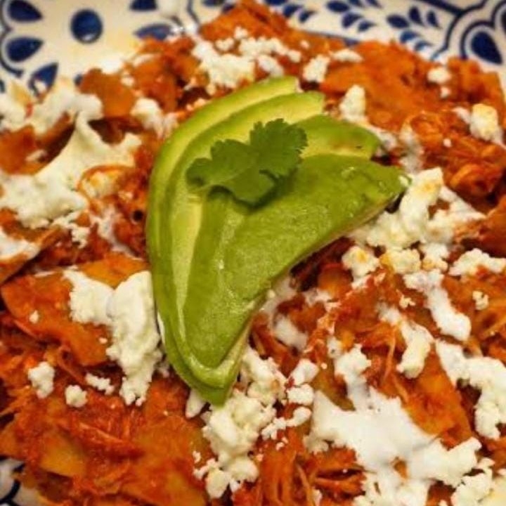 Deliciosos chilaquiles tradicionales acompañados de queso crema cebolla y aguacate