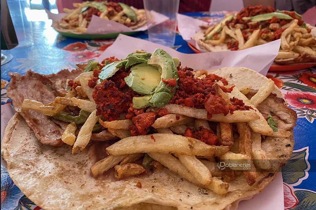 De maíz con frijoles, salsa, cebolla, queso, chicharrón, champiñón, bistec y longaniza.