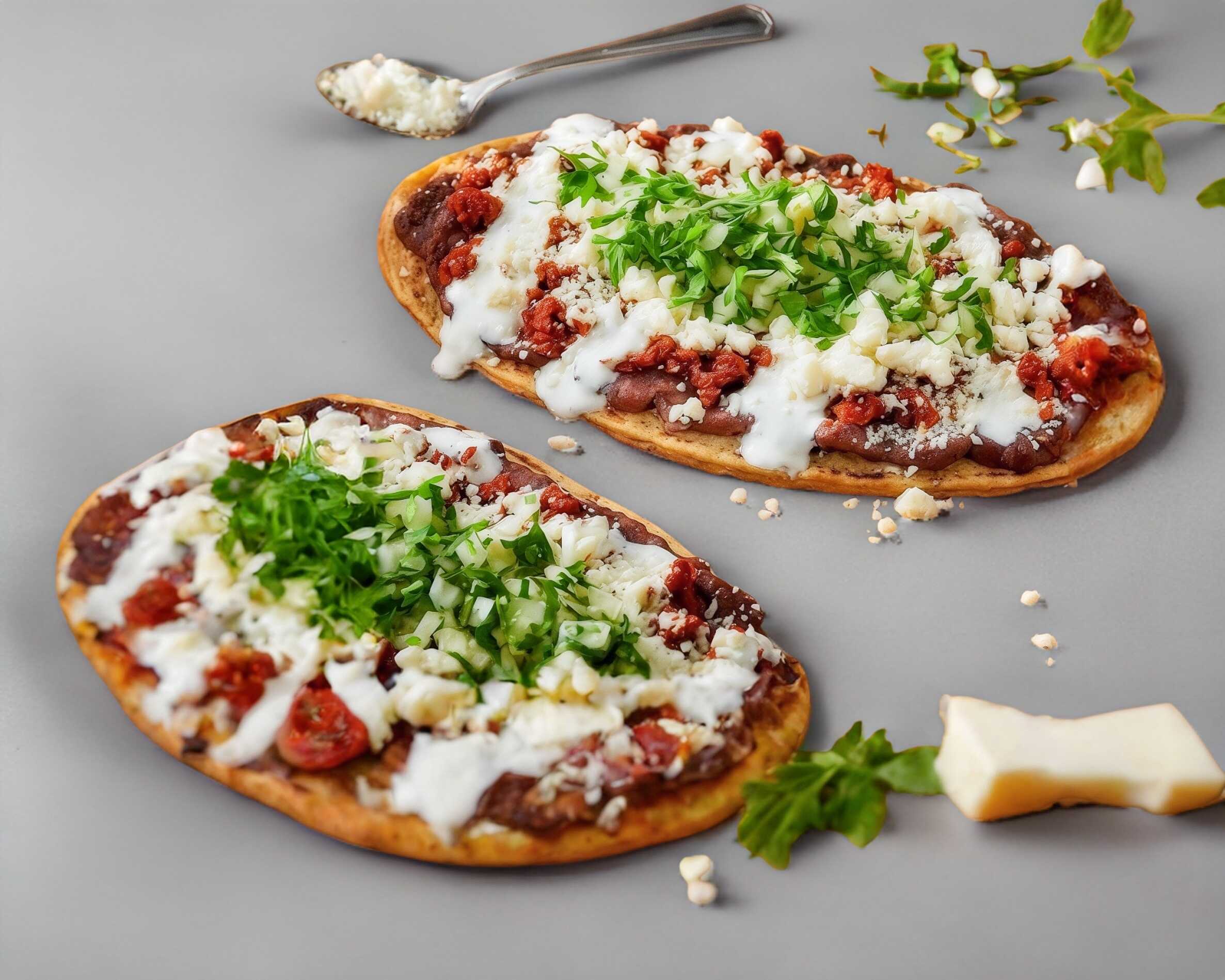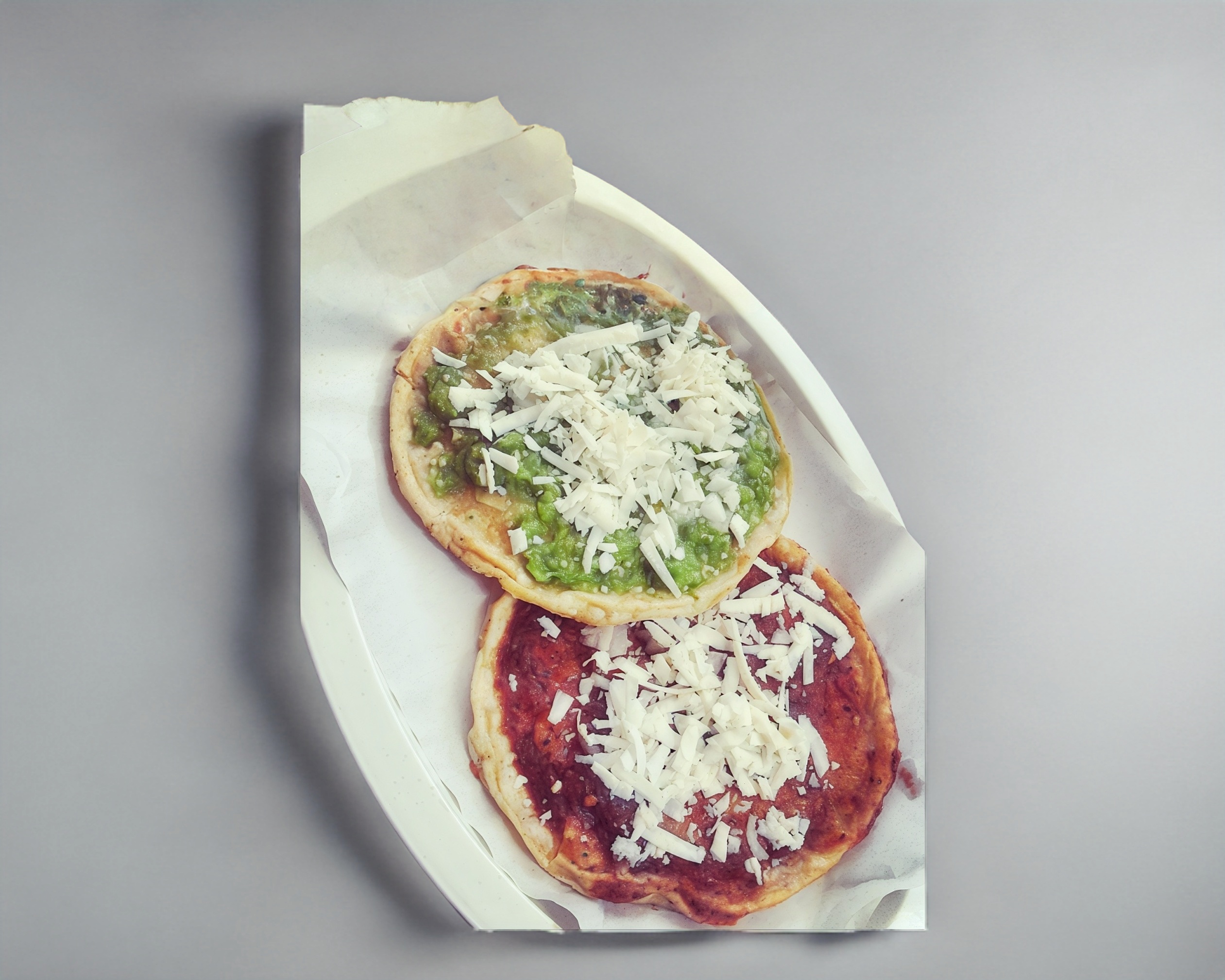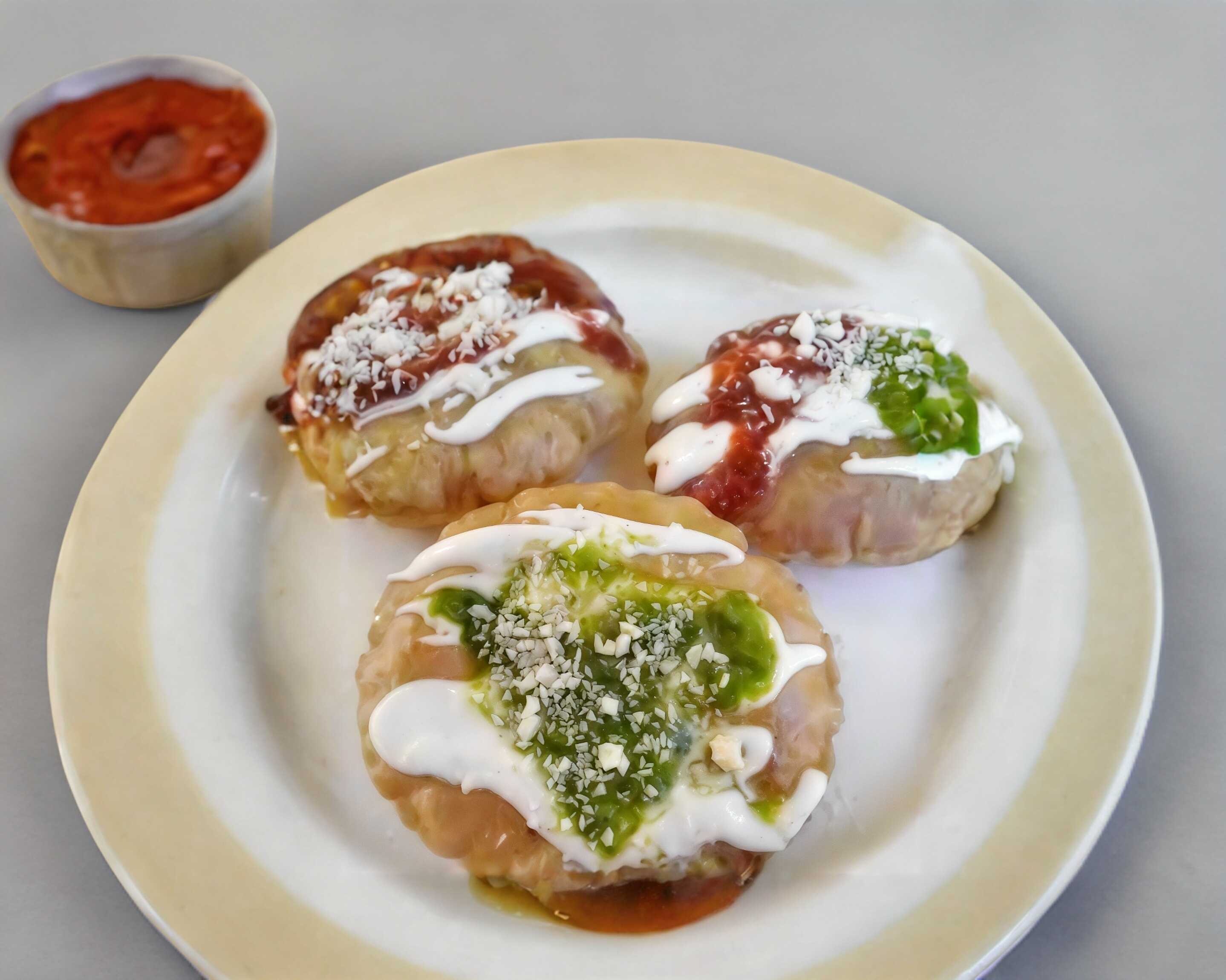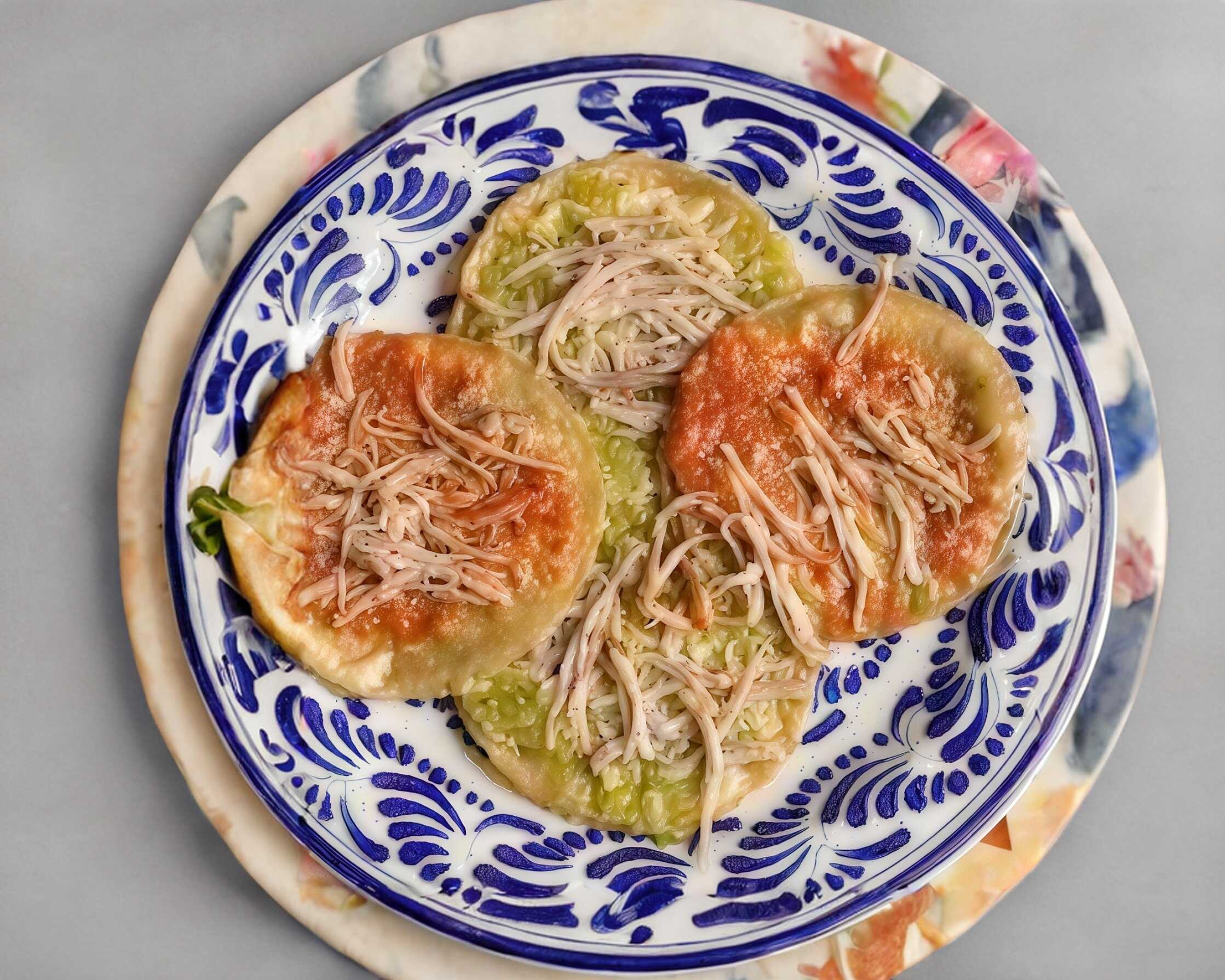 Masa frita acompañada de frijol, salsa, queso y crema.