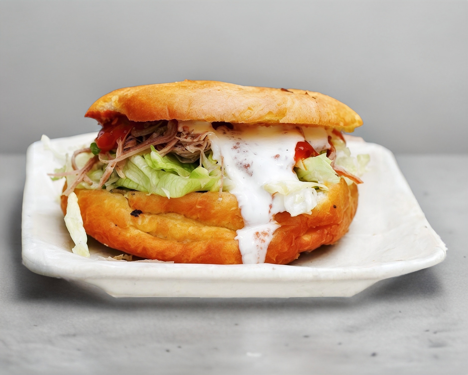 Rellena de pollo, aguacate y lechuga, bañada en adobo.