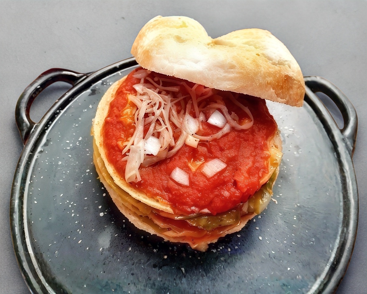 Hamburguesa de la casa, acompañada de lechuga, jamón, queso, champiñones, rajas, jitomate y cebolla