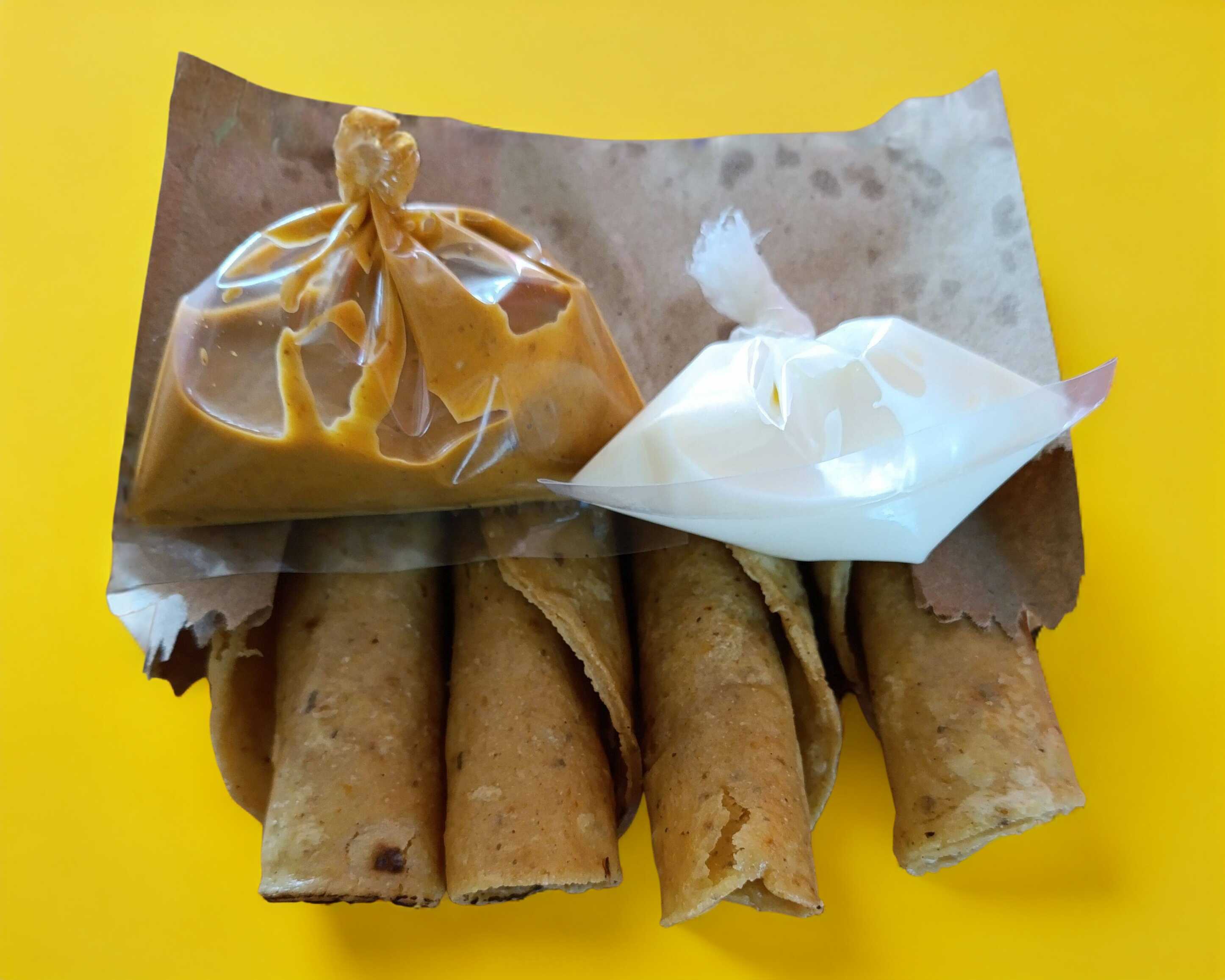 4 tacos dorados de papá ,con crema y salsa se entregan en bolsa de papel