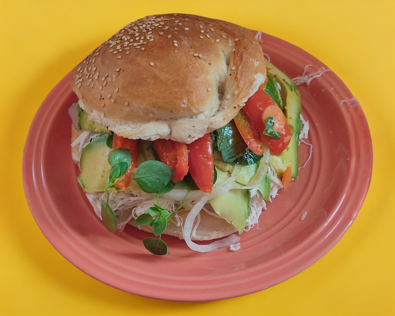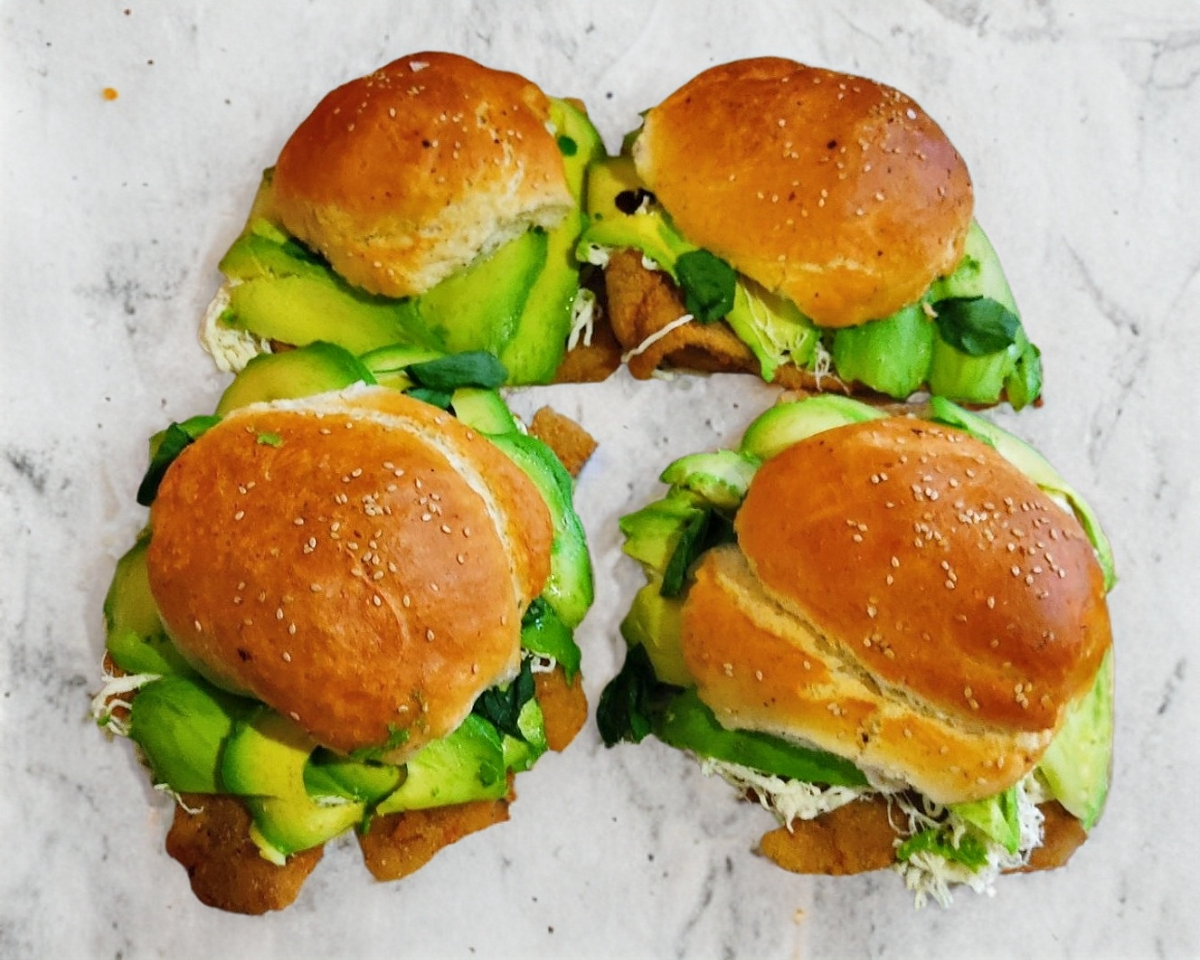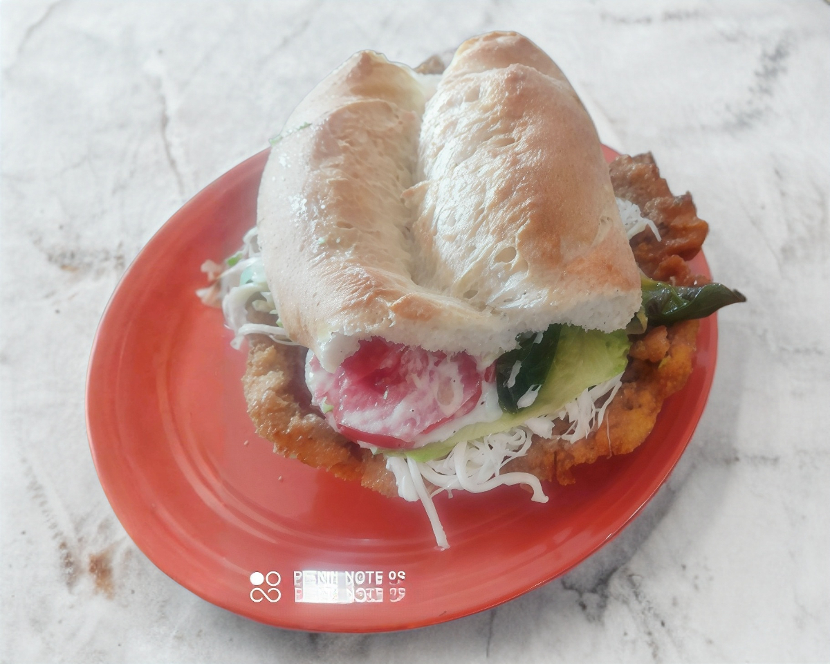 Cemita de tamaño normal milanesa, quesillo, aguacate, pápalo, cebolla y picante a elegir.