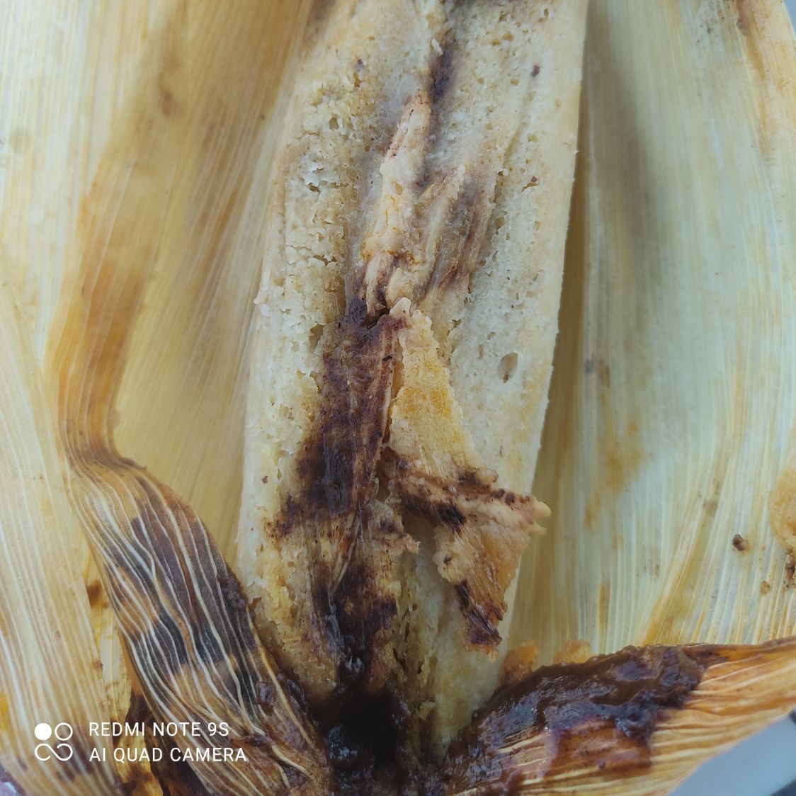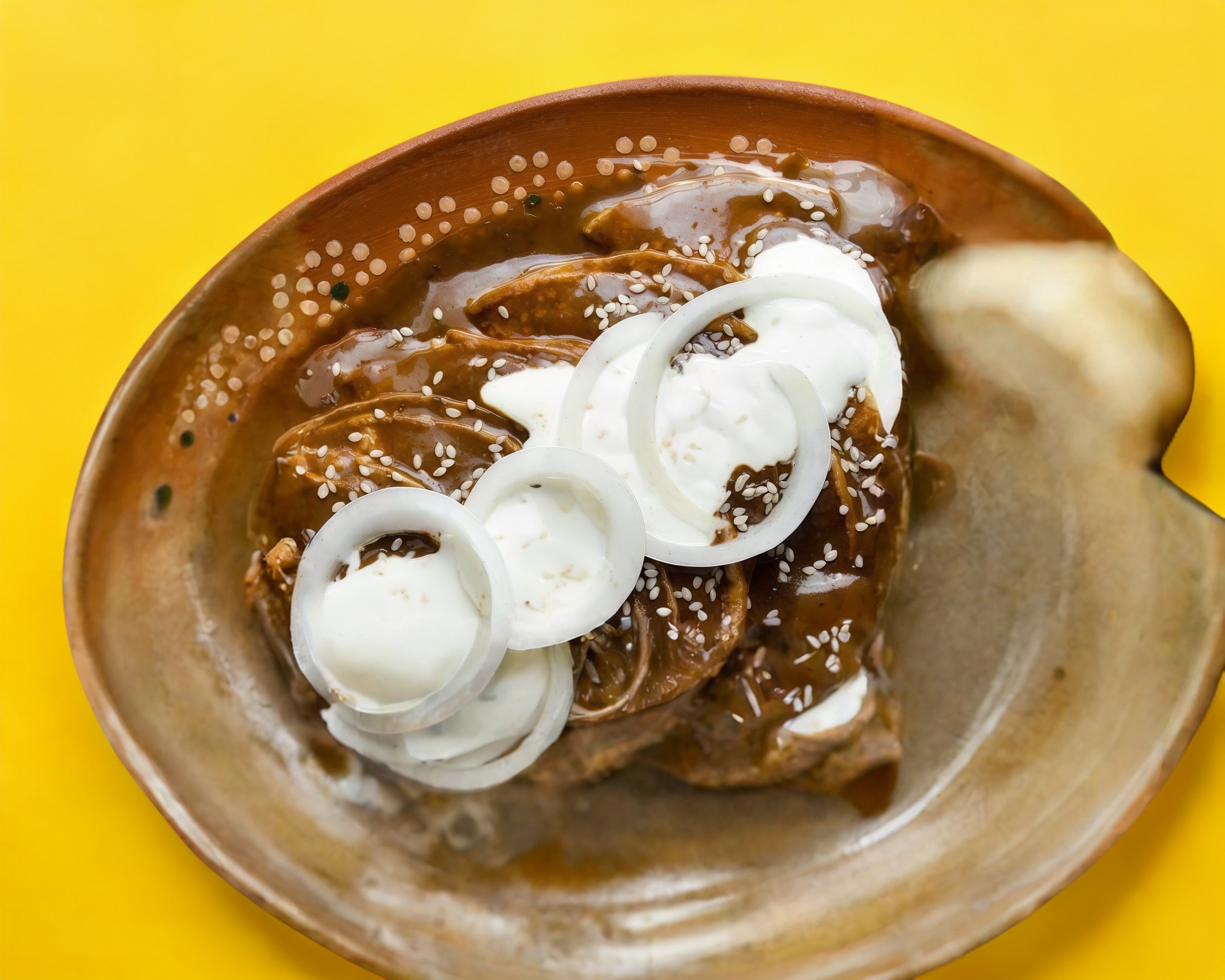 4 tortillas fritas ,bañadas con un rico mole poblana ajonjolí,cebolla