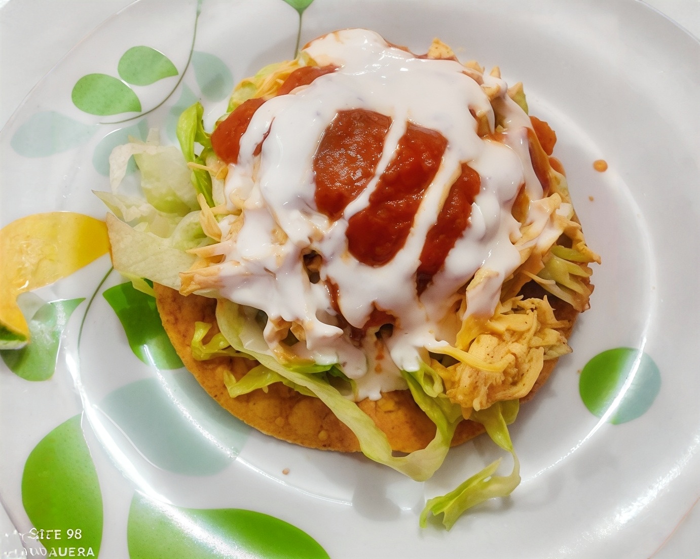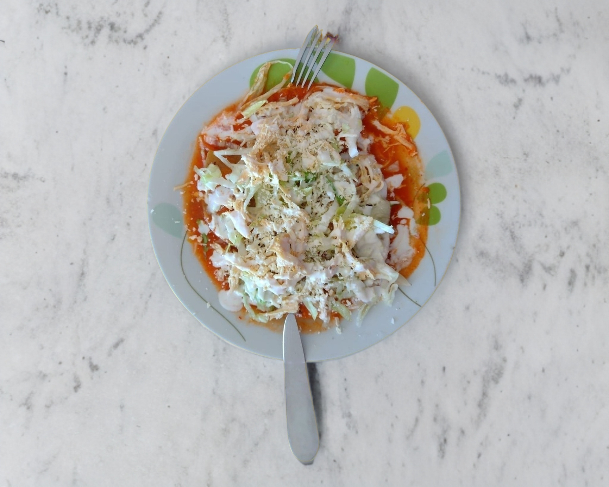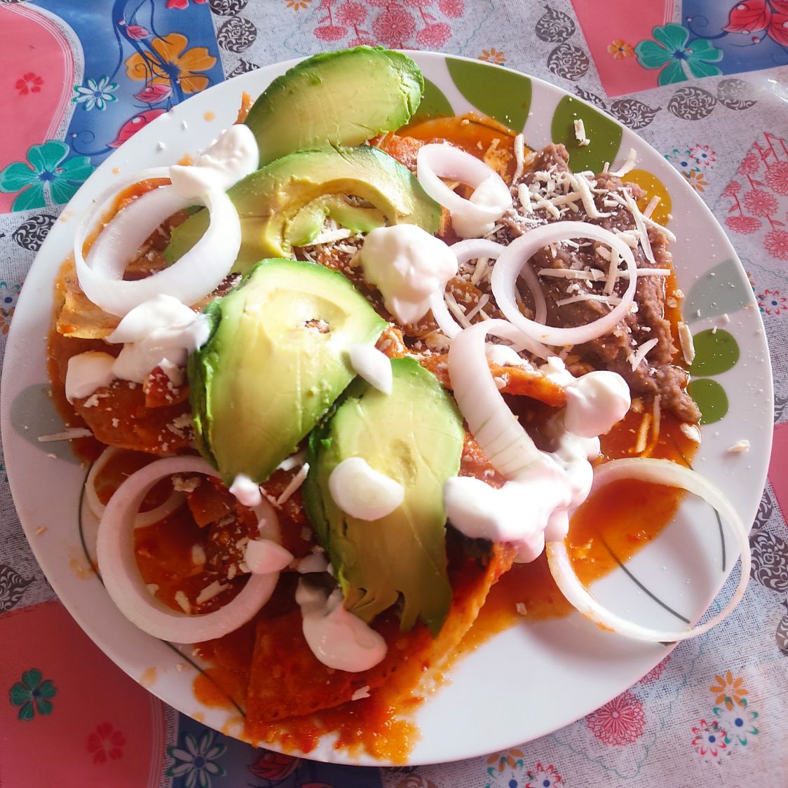 4 tortillas fritas bañadas en salsa de su elección acompañadas por lechuga ,crema ,qeuo añejo y cebolla