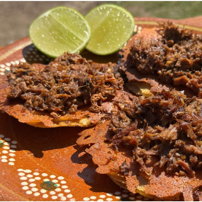 3 Pza. Tortilla frita en aceite C/queso gratinado y carne de birria. Cebolla, cilantro, limón. Incluye consomé de 350ml.