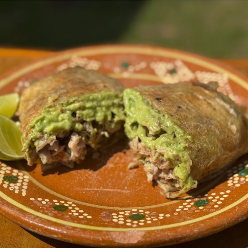 1pza. Burrito de asada. queso, carne, guacamole, cebolla y cilantro.