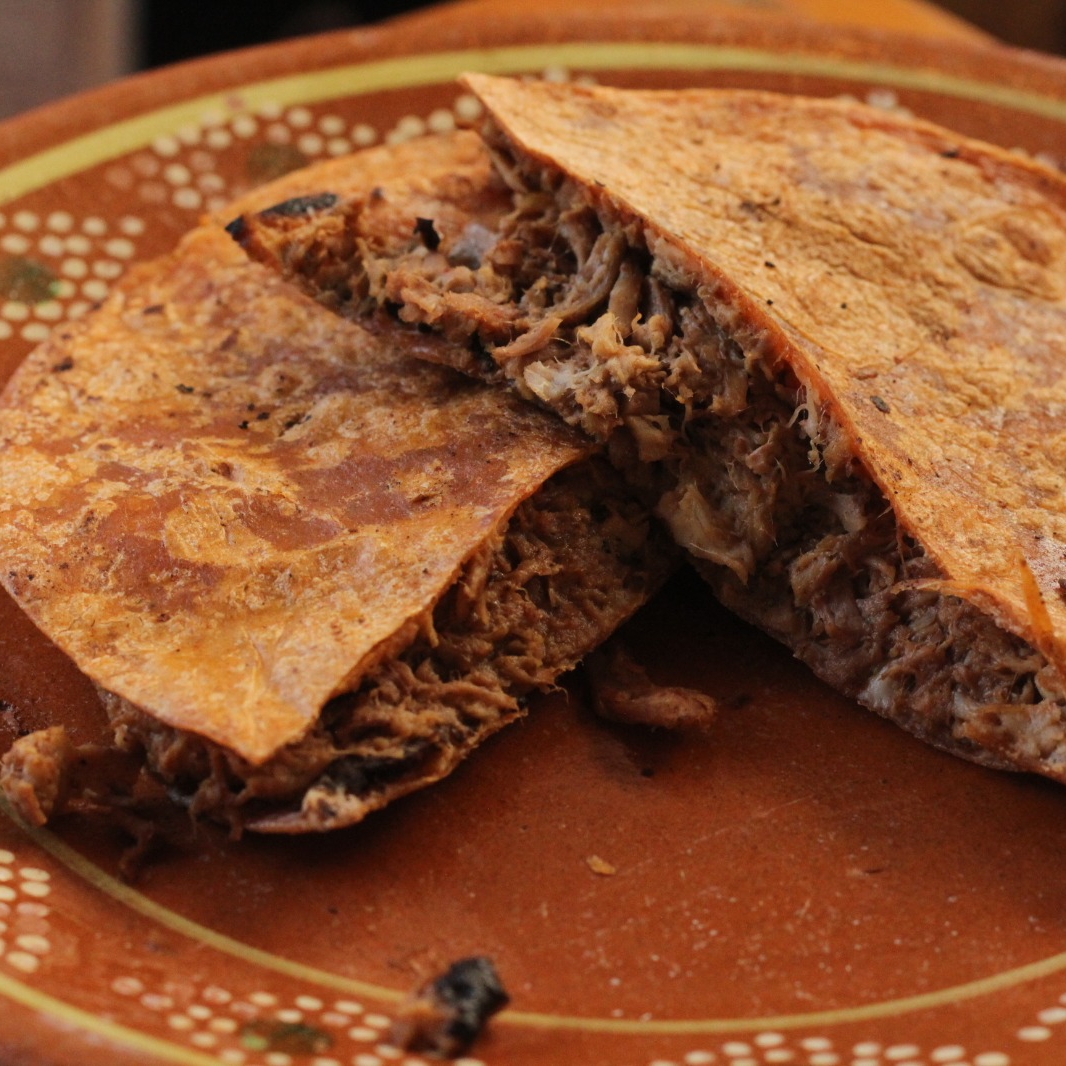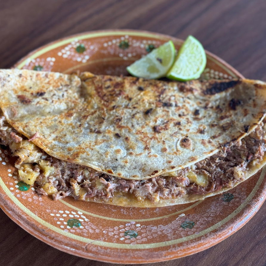 Quesadilla de harina de 30cm de largo. Queso, birria, piña, cebolla, cilantro. consomé gratis de 350ml