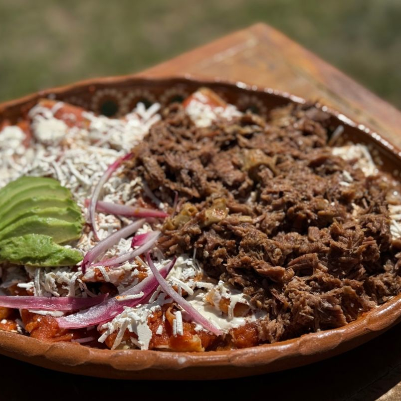 Chilaquiles verdes o rojos acompañados de carne de birria, cebolla queso, crema, aguacate