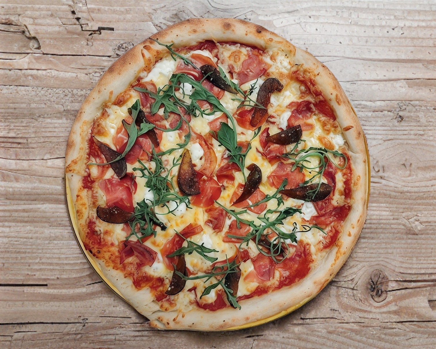 Masa fina y crujiente con salsa de tomate casera, queso manchego, queso de cabra, jamón serrano, higos cristalizados y arúgula.